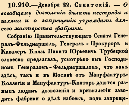 Собранію Правительствующаго Сената Генераль - Фельдмаршалъ, Генералъ - Прокуроръ и Кавалеръ Князь Никита Юрьевичь Трубецкой словесно предлагалъ, усмотрѣно имъ Господиномъ Генераломъ Фельдмаршаломъ, что какъ здѣсь, такъ и въ Москвѣ отъ Мануфактурь - Коллегіи и Мануфактуръ - Конторъ даются разнымъ людямъ дозволенія и привиллегіи заводить фабрики о дѣлѣ набоекъ, подъ запрещеніемъ другимъ, что не за фабрику, но только за одно мастерство и рукодѣліе почитать должно, дѣлаются жъ подъ запрещеніемъ другимъ на фабрикахъ шляпы, добротою противъ солдатскихъ, и ниже, отъ чего многіе мастеровые люди пропитаніе имѣли, а нынѣ имъ то запрещается; того ради не соблаговолено ли будетъ, какъ набойки, такъ и шляпы, добротою противу солдатскихъ и ниже, всякому кто пожелаетъ, дѣлать безъ запрещенія, а въ заведе піи для того фабрикъ не позволять, дабы чрезъ то у мастеровыхъ людей пропитаніе отъемлемо не было; а при томъ на какія именно фабрики и по какимъ указамъ къ заведенію позволенія и привиллегіи даны, въ Правительствующій Сенать подать вѣдомость. А впредь о заведеніи какихъ фабрикъ, въ силѣ даннаго той Коллегіи въ 1723 году Декабря 3 дня, за подписаніемъ, блаженныя и вѣчной славы достойныя памяти, Государя Императора Петра Великаго, Регламента, позволенія давать и привиллегіями снабжать, и что именно за фабрики почитать; и что жъ, кромѣ фабрикъ и мануфактуръ, за одно рукодѣ ліе и мастерство признавать должно, о томъ Мануфактурь-Коллегіи, сшедшись обще съ Главнымъ Магистратомъ, разсмотря, представить въ Правительствующій Сенать общее мнѣніе, дабы по тому надлежащее опредѣленіе учинить возможно было, немедленно. При чемъ докладывано по присланному изъ Мануфактуръ-Коллегіи доношенію, что за фабрики и за ремеслы подлаго народа почитать надлежить; ПРИКАЗАЛИ: ВО всемъ быть по тому его Господина Генералъ-Фельдмаршала и Генералъ Прокурора предложенію; ибо, хотя въ 1753 году изъ Мануфактуръ-Коллегіи мнѣніе и прислано, только оное учинено съ разсужденія одной той Коллегіи, и всякія мастерства по большой части почитаются за фабрики, чрезъ что у мастеровыхъ, какъ крестьянъ, такъ и прочихъ промышляющихъ тѣмъ людей, пропитаніе отнято быть можеть. И о томъ въ Мануфактурь - Колллегію, и оной въ Контору и въ Главный Магистратъ послать указы, съ такитъ подтвержденіемъ, чтобъ вышеписанныя вѣдомости и мнѣніе присланы были въ Сенать, не продолжая далѣе мѣсяца, неотмѣнно.