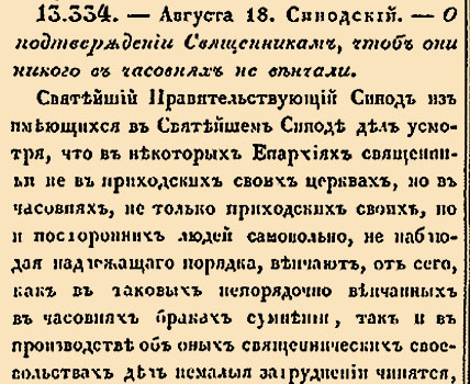 Святейший Правительствующий Синод из имеющихся в Святейшем Синоде дел усмотря, что в некоторых Епархиях священники не в приходских своих церквах, но в часовнях, не только приходских своих, но и посторонних людей самовольно, не наблюдая надлежащего порядка, венчают, от сего как в таковых непорядочно венчанных в часовнях браках сумнении, так и в производстве об оных священнических своевольствах дел немалые затруднения чинятся <...>