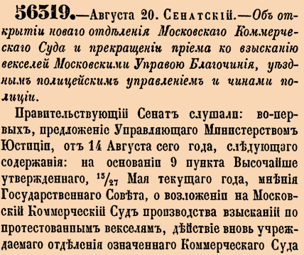 56319. 1876 год. 1 сентября (20 августа ст.ст.) Сенатский. Об открытии новаго отделения Московскаго Коммерческаго Суда и прекращении приема ко взысканию векселей Московскими Управою Благочиния, уездным полицейским управлением и чинами полиции Приказали: О вышеизложенном Московским Генерал-Губернаторам и Коммерческому Суду дать знать указами, в Департамент министерства Юстиции передать копию с определения и припечатать в установленном порядке