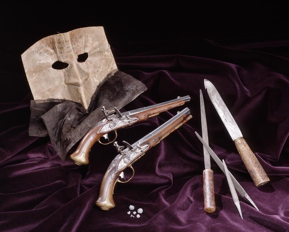 Орудия Анкарстрёма, убийцы короля Швеции Густава III: Маска, в которой он проник на бал; пистолет; самодельная картечь и напильники для ее изготовления; зазубренный нож, которым он рассчитывал воспользоваться на случай осечки.