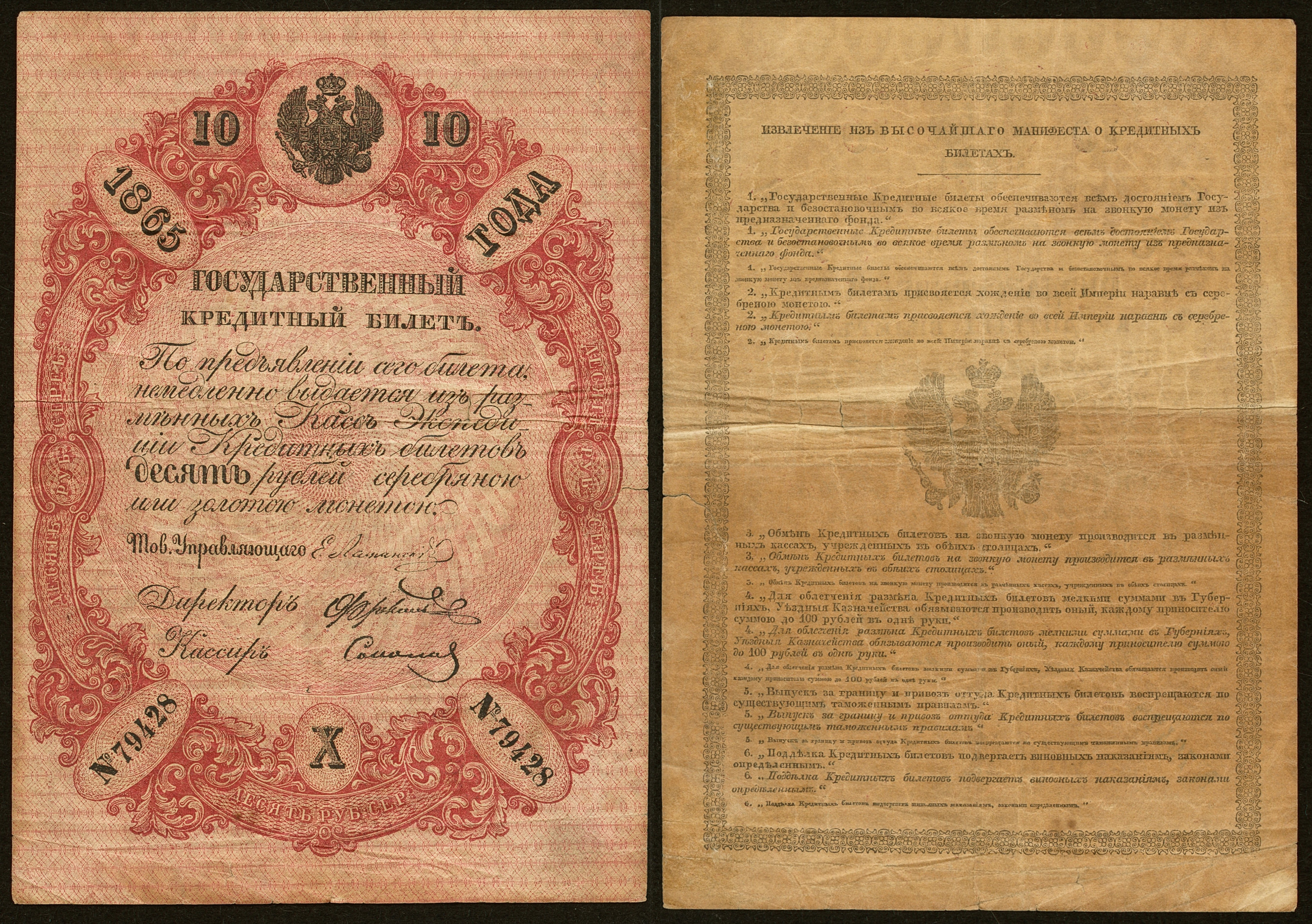 Кредитный билет на 10 рублей 1865 г.