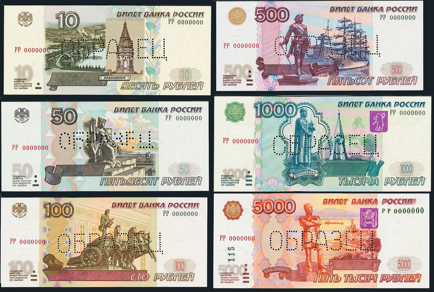 Банковские образцы 1997 г. первой серии (и 2004 для 5000 рублей)