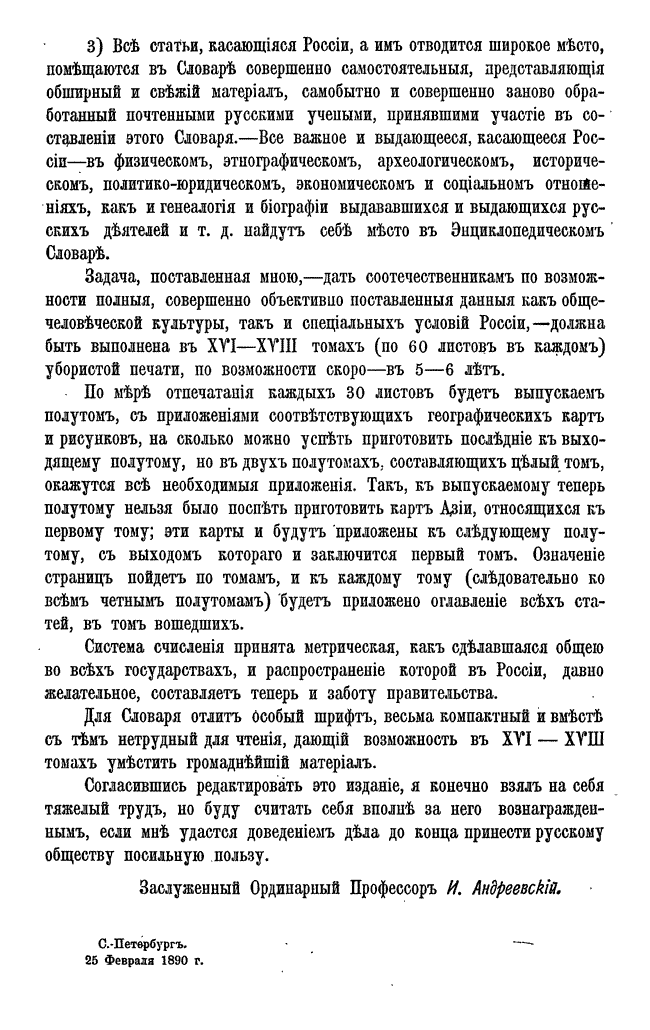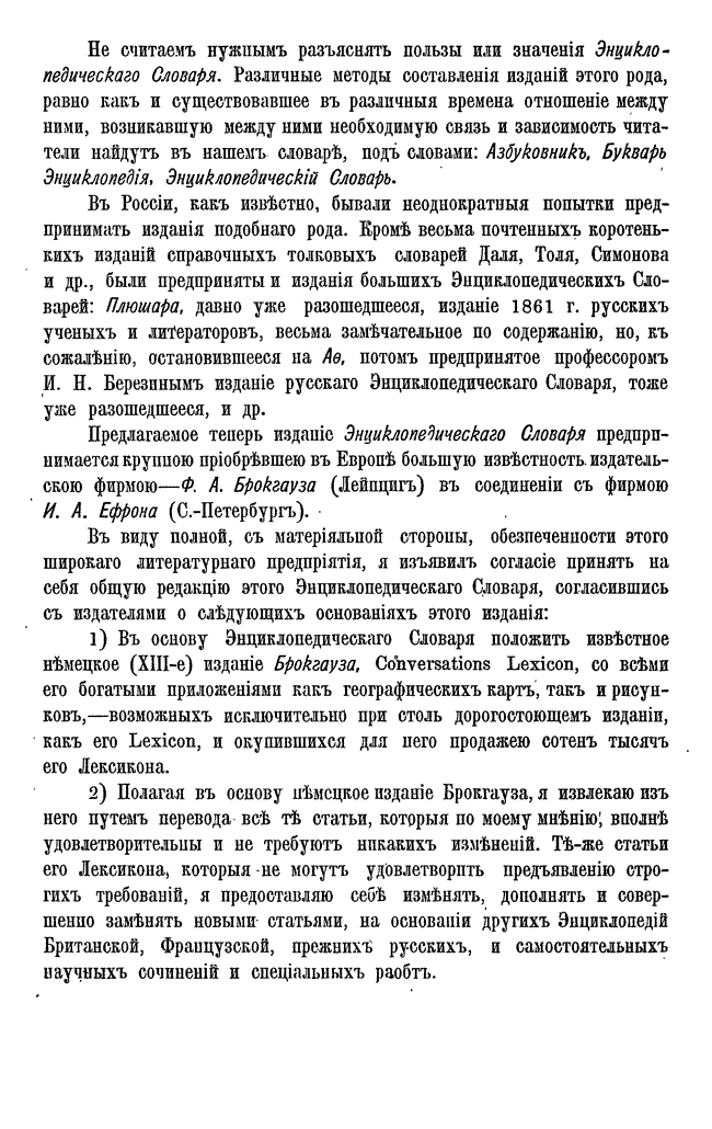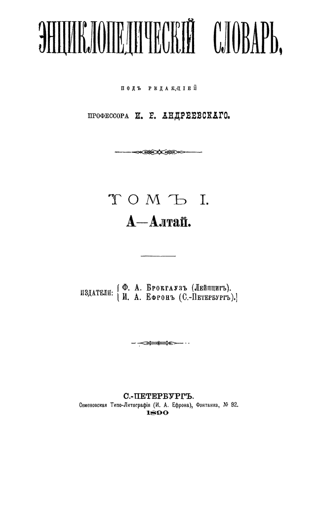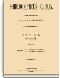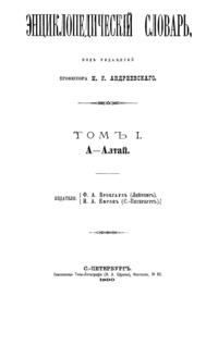 Самая крупная дореволюционная русская универсальная энциклопедия, выпущенная акционерным издательским обществом «Ф. А. Брокгауз — И. А. Ефрон». Состоит из 86 томов (82 основных и 4 дополнительных), выходивших в течение 1890-1907 годов. Первые 8 томов (до буквы «В») вышли под общей редакцией профессора И. Е. Андреевского и в основном содержали переводы на русский язык статей знаменитой немецкой энциклопедии Брокгауза «Konversations Lexikon».