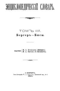 Самая крупная дореволюционная русская универсальная энциклопедия, выпущенная акционерным издательским обществом «Ф. А. Брокгауз — И. А. Ефрон». Состоит из 86 томов (82 основных и 4 дополнительных), выходивших в течение 1890-1907 годов. Первые 8 томов (до буквы «В») вышли под общей редакцией профессора И. Е. Андреевского и в основном содержали переводы на русский язык статей знаменитой немецкой энциклопедии Брокгауза «Konversations Lexikon».