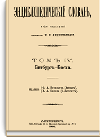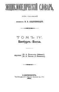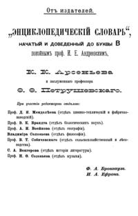 Самая крупная дореволюционная русская универсальная энциклопедия, выпущенная акционерным издательским обществом «Ф. А. Брокгауз — И. А. Ефрон». Состоит из 86 томов (82 основных и 4 дополнительных), выходивших в течение 1890-1907 годов. Первые 8 томов (до буквы «В») вышли под общей редакцией профессора И. Е. Андреевского и в основном содержали переводы на русский язык статей знаменитой немецкой энциклопедии Брокгауза «Konversations Lexikon».