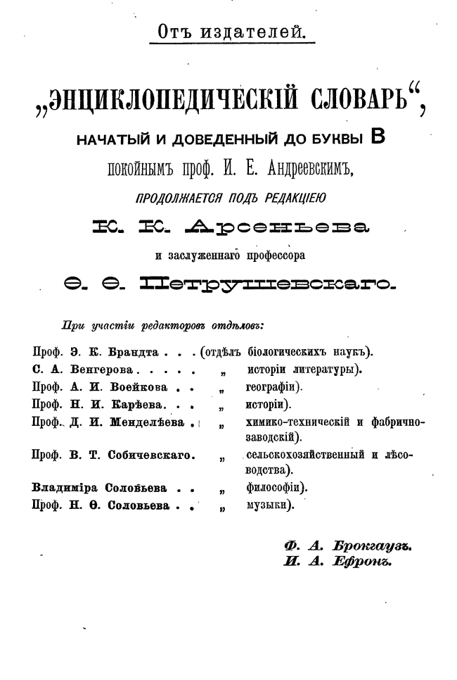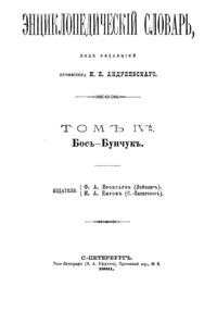 Самая крупная дореволюционная русская универсальная энциклопедия, выпущенная акционерным издательским обществом «Ф. А. Брокгауз — И. А. Ефрон». Состоит из 86 томов (82 основных и 4 дополнительных), выходивших в течение 1890-1907 годов. Первые 8 томов (до буквы «В») вышли под общей редакцией профессора И. Е. Андреевского и в основном содержали переводы на русский язык статей знаменитой немецкой энциклопедии Брокгауза «Konversations Lexikon».
