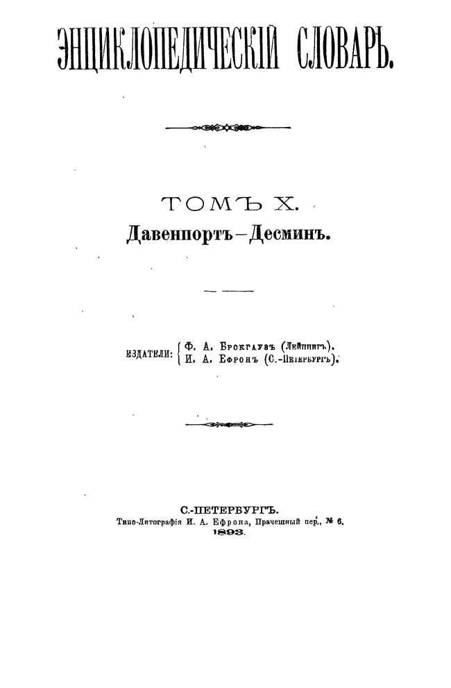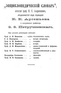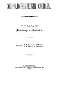 Самая крупная дореволюционная русская универсальная энциклопедия, выпущенная акционерным издательским обществом «Ф. А. Брокгауз — И. А. Ефрон». Состоит из 86 томов (82 основных и 4 дополнительных), выходивших в течение 1890-1907 годов. Первые 8 томов (до буквы «В») вышли под общей редакцией профессора И. Е. Андреевского и в основном содержали переводы на русский язык статей знаменитой немецкой энциклопедии Брокгауза «Konversations Lexikon».