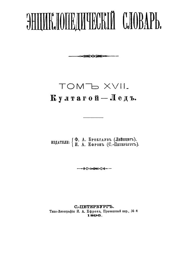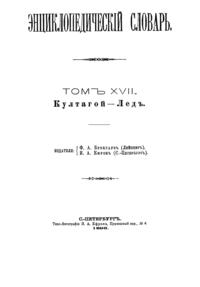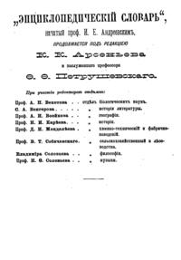 Самая крупная дореволюционная русская универсальная энциклопедия, выпущенная акционерным издательским обществом «Ф. А. Брокгауз — И. А. Ефрон». Состоит из 86 томов (82 основных и 4 дополнительных), выходивших в течение 1890-1907 годов. Первые 8 томов (до буквы «В») вышли под общей редакцией профессора И. Е. Андреевского и в основном содержали переводы на русский язык статей знаменитой немецкой энциклопедии Брокгауза «Konversations Lexikon».