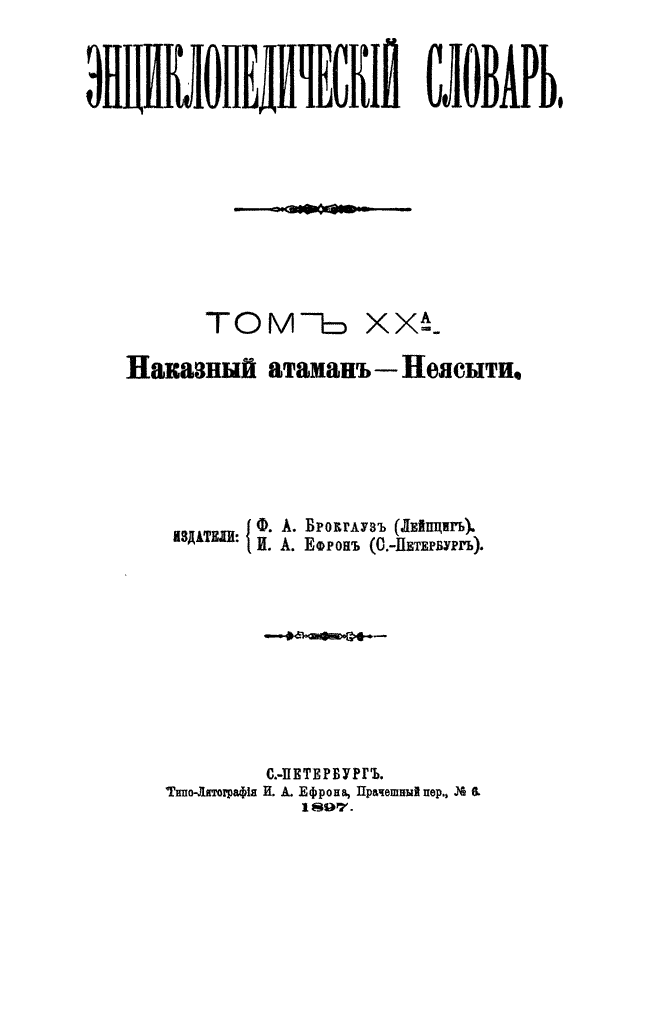 Самая крупная дореволюционная русская универсальная энциклопедия, выпущенная акционерным издательским обществом «Ф. А. Брокгауз — И. А. Ефрон». Состоит из 86 томов (82 основных и 4 дополнительных), выходивших в течение 1890-1907 годов. Первые 8 томов (до буквы «В») вышли под общей редакцией профессора И. Е. Андреевского и в основном содержали переводы на русский язык статей знаменитой немецкой энциклопедии Брокгауза «Konversations Lexikon».
