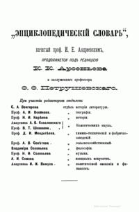Самая крупная дореволюционная русская универсальная энциклопедия, выпущенная акционерным издательским обществом «Ф. А. Брокгауз — И. А. Ефрон». Состоит из 86 томов (82 основных и 4 дополнительных), выходивших в течение 1890-1907 годов. Первые 8 томов (до буквы «В») вышли под общей редакцией профессора И. Е. Андреевского и в основном содержали переводы на русский язык статей знаменитой немецкой энциклопедии Брокгауза «Konversations Lexikon».