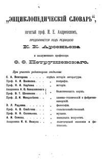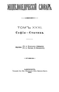 Самая крупная дореволюционная русская универсальная энциклопедия, выпущенная акционерным издательским обществом «Ф. А. Брокгауз — И. А. Ефрон». Состоит из 86 томов (82 основных и 4 дополнительных), выходивших в течение 1890-1907 годов. Первые 8 томов (до буквы «В») вышли под общей редакцией профессора И. Е. Андреевского и в основном содержали переводы на русский язык статей знаменитой немецкой энциклопедии Брокгауза «Konversations Lexikon».