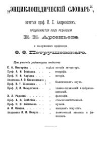 Самая крупная дореволюционная русская универсальная энциклопедия, выпущенная акционерным издательским обществом «Ф. А. Брокгауз — И. А. Ефрон». Состоит из 86 томов (82 основных и 4 дополнительных), выходивших в течение 1890-1907 годов. Первые 8 томов (до буквы «В») вышли под общей редакцией профессора И. Е. Андреевского и в основном содержали переводы на русский язык статей знаменитой немецкой энциклопедии Брокгауза «Konversations Lexikon».