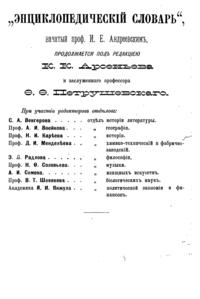 Самая крупная дореволюционная русская универсальная энциклопедия, выпущенная акционерным издательским обществом «Ф. А. Брокгауз — И. А. Ефрон». Состоит из 86 томов (82 основных и 4 дополнительных), выходивших в течение 1890-1907 годов. Первые 8 томов (до буквы «В») вышли под общей редакцией профессора И. Е. Андреевского и в основном содержали переводы на русский язык статей знаменитой немецкой энциклопедии Брокгауза «Konversations Lexikon».