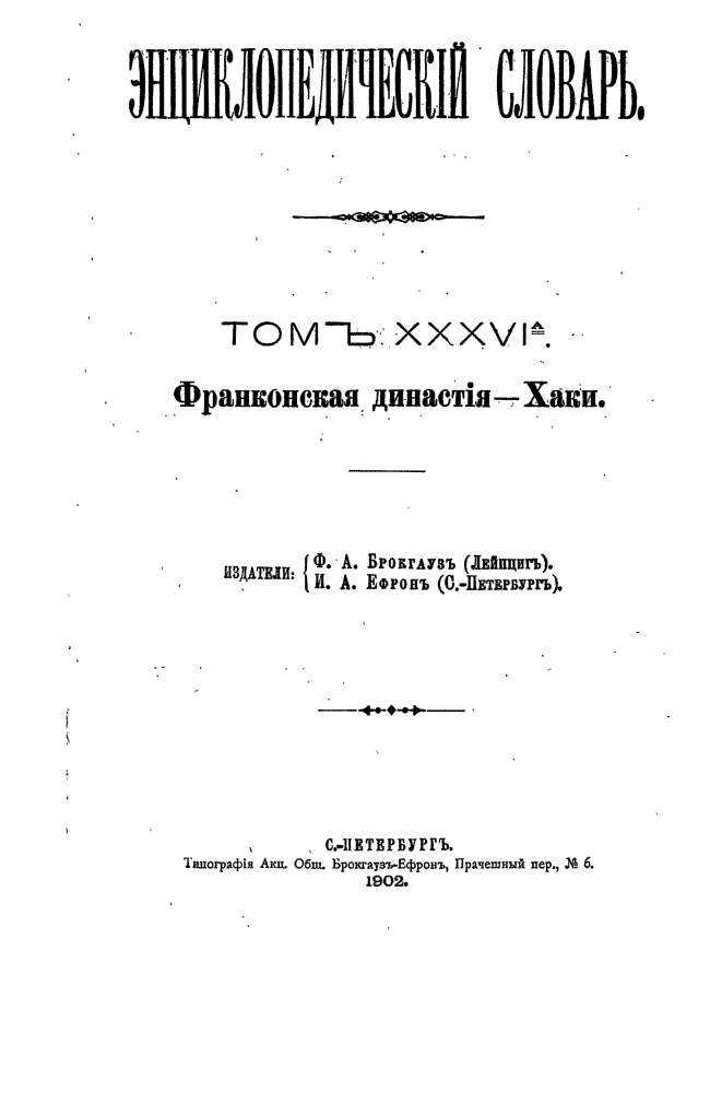 Самая крупная дореволюционная русская универсальная энциклопедия, выпущенная акционерным издательским обществом «Ф. А. Брокгауз — И. А. Ефрон». Состоит из 86 томов (82 основных и 4 дополнительных), выходивших в течение 1890-1907 годов. Первые 8 томов (до буквы «В») вышли под общей редакцией профессора И. Е. Андреевского и в основном содержали переводы на русский язык статей знаменитой немецкой энциклопедии Брокгауза «Konversations Lexikon».
