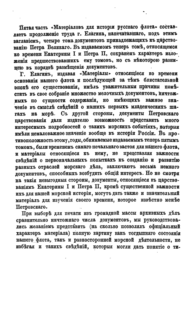 Первые 5 томов издания «Материалы для истории русского флота», изданные в 1865-1875 гг., были подготовлены историографом Российского флота С. И. Елагиным (1824 — 1868). После его смерти работу по написанию «Материалов...» продолжили его сотрудники и Ф.Ф. Веселаго. Всего же было издано 18 томов в период с 1865 по 1904 гг.
