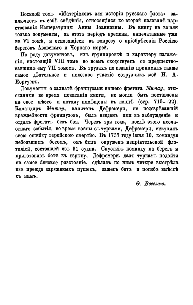 Первые 5 томов издания «Материалы для истории русского флота», изданные в 1865-1875 гг., были подготовлены историографом Российского флота С. И. Елагиным (1824 — 1868). После его смерти работу по написанию «Материалов...» продолжили его сотрудники и Ф.Ф. Веселаго. Всего же было издано 18 томов в период с 1865 по 1904 гг.