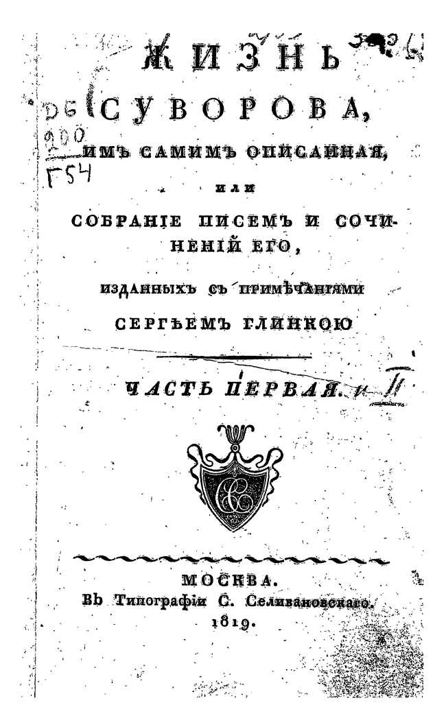 В 1812 году С. Глинка выпускает книгу «Жизнь Суворова, им самим описанная, или собрание писем и сочинений его». Эта, о двух частях, работа подытожила труды предшественников Глинки по публикации и введению в научный оборот памятников литературного наследия Суворова. Кроме того, книга содержит обширное исследование самого Сергея Глинки, посвященное жизни Суворова и его литературному наследию.