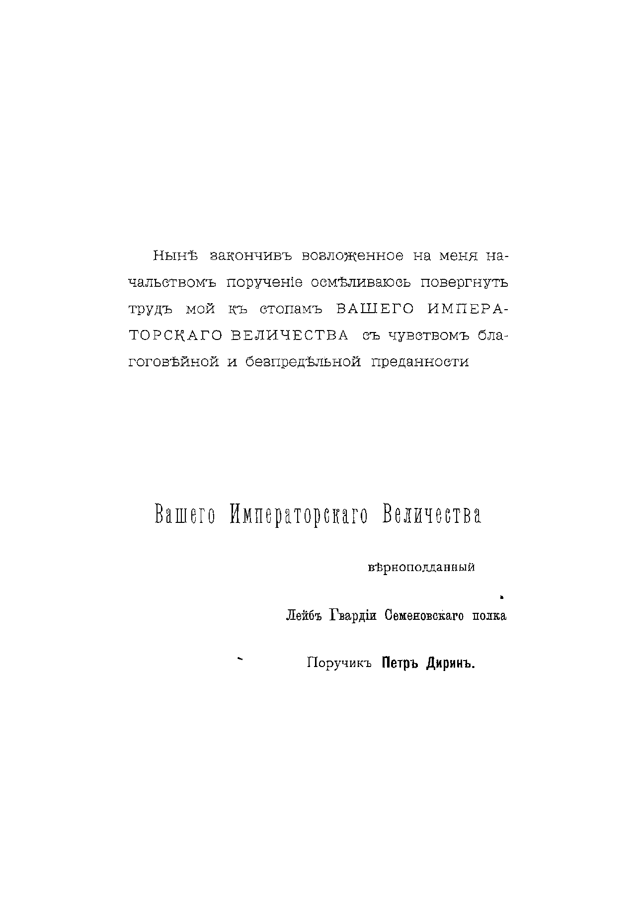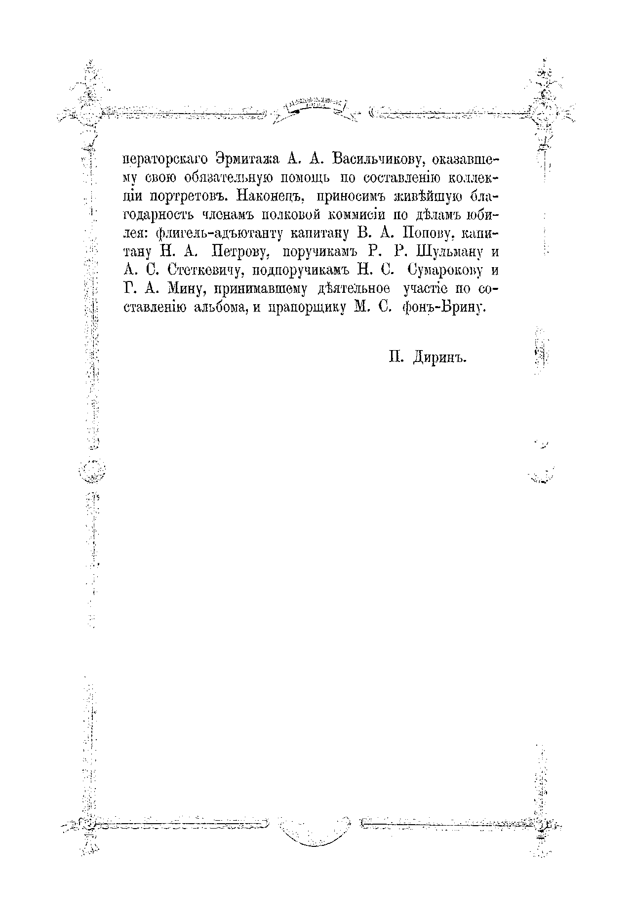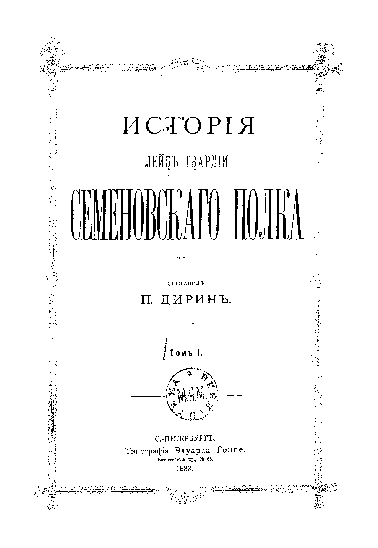 В 1883 г. в Санкт-Петербурге вышло в свет двухтомное издание, посвященное истории лейб-гвардии Семеновского полка, составленное поручиком Петром Дириным. Один из старейших полков российской армии — Семеновский — был сформирован в конце XVII века в подмосковном селе Семеновском из «потешных войск», созданных для забавы царевича Петра. В 1700 г. полк стал лейб-гвардейским, принимал участие во многих войнах, подавлении мятежей и дворцовых переворотах; в нем начинали военную службу генералиссимус А. В. Суворов-Рымникский, флотоводец А. Г. Орлов-Чесменский и фельдмаршал И. И. Дибич-Забалканский; его шефами были императоры и великие князья. Альбом иллюстраций состоит из двух листов текста и 38-ми отдельных листов монохромных изображений. На страницах альбома представлены портреты императоров, императриц, великих князей, командиров лейб-гвардии, рисунки форм обмундирования различных воинских чинов, а также иллюстрации крупнейших сражений Семеновского полка.