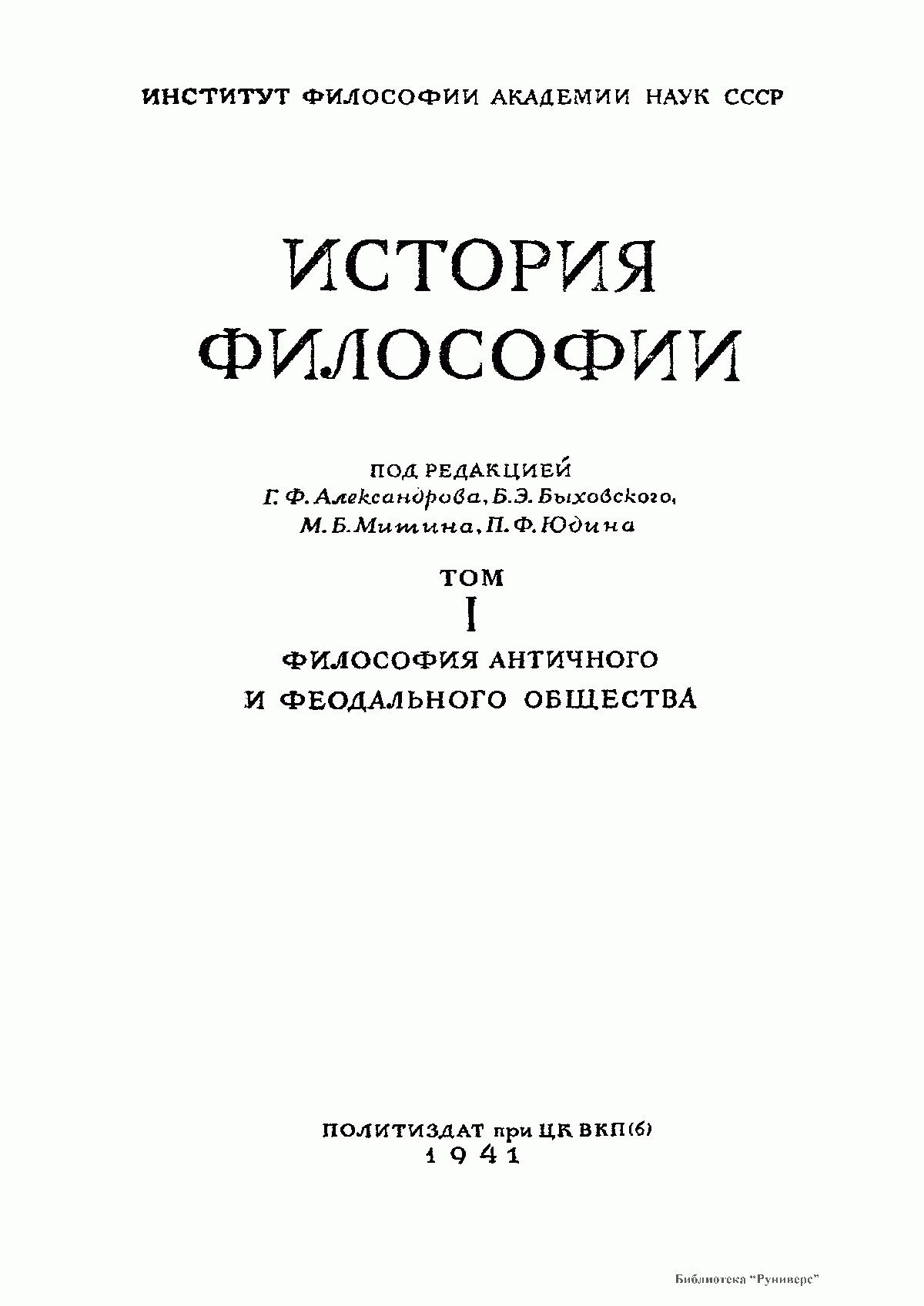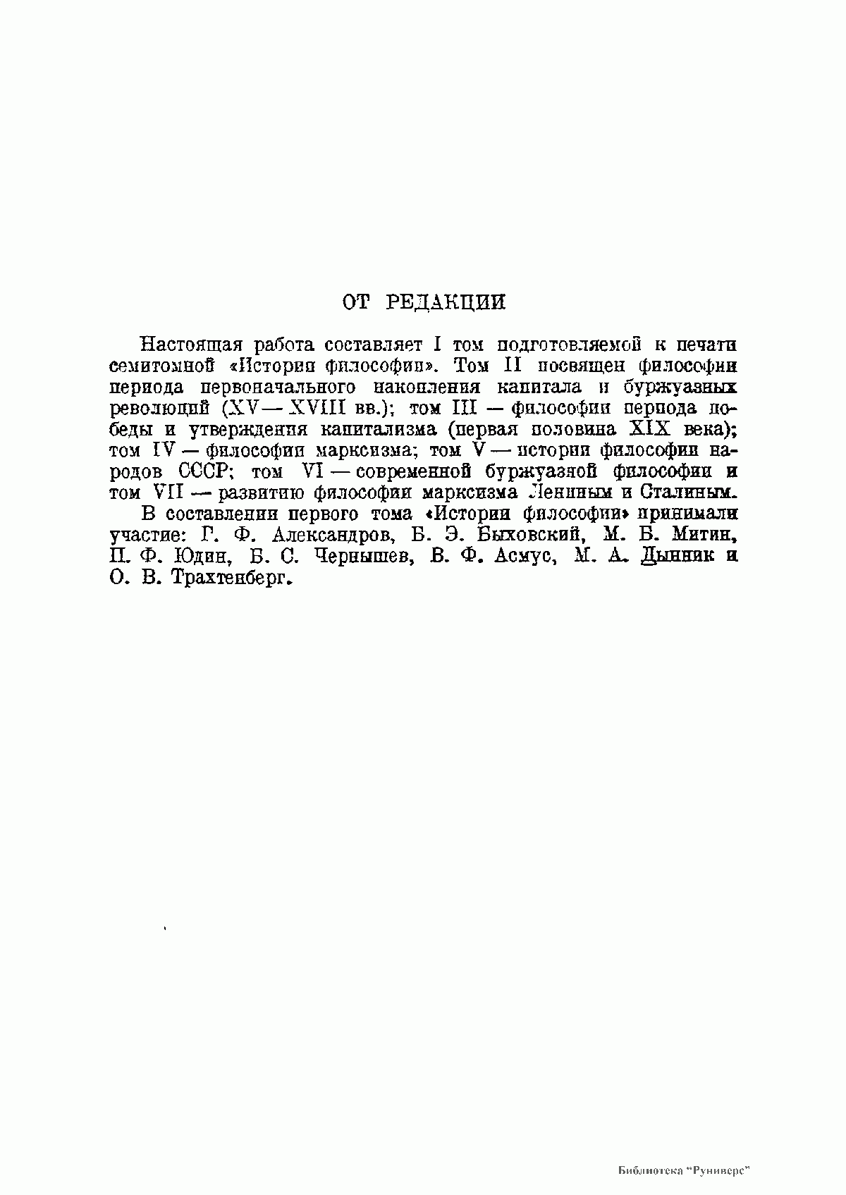 Данные работы представляют тома планировавшейся к печати семитомной «Истории философии». Том I посвящен философии античного и феодального общества, том II посвящен философии периода первоначального накопления капитала и буржуазных революций (XV— XVIII вв.); том III — философии периода победы и утверждения капитализма (первая половина XIX века); том IV — философии марксизма; том V — истории философии народов СССР; том VI — современной буржуазной философии и том VII — развитию философии марксизма