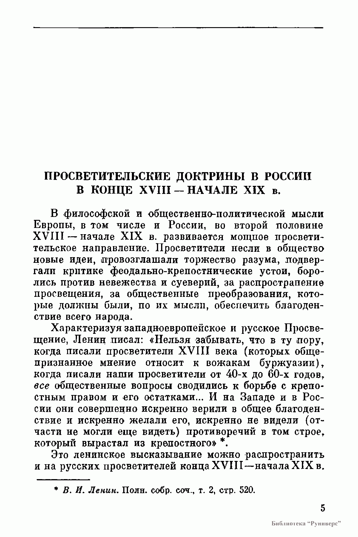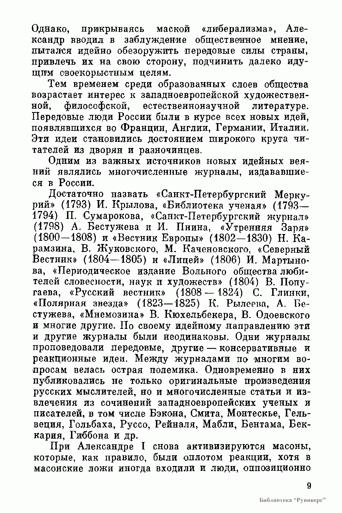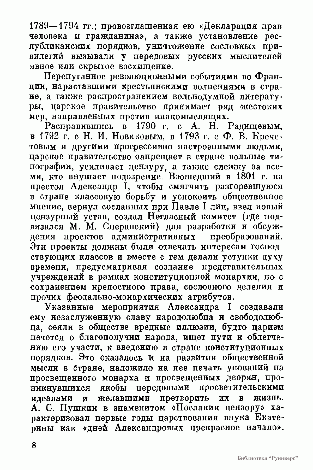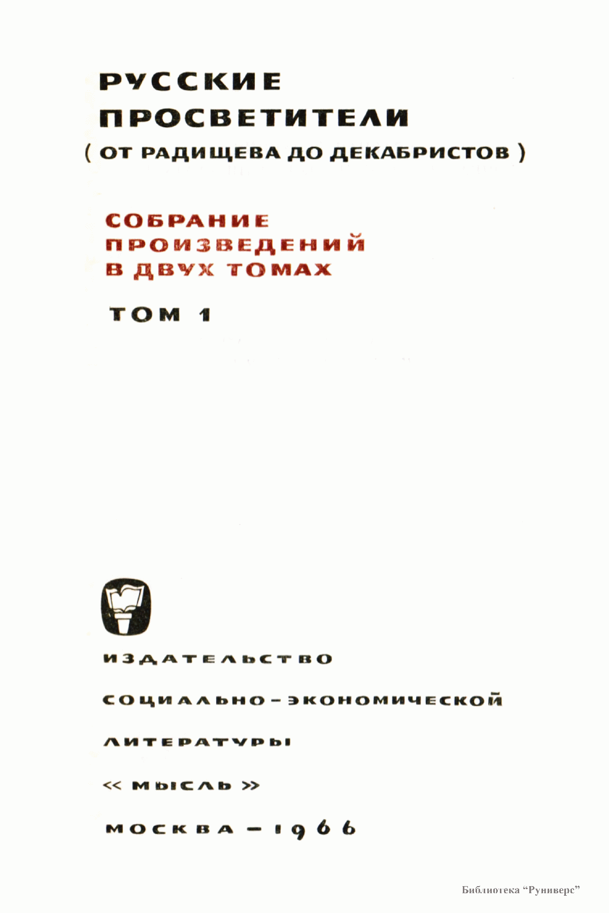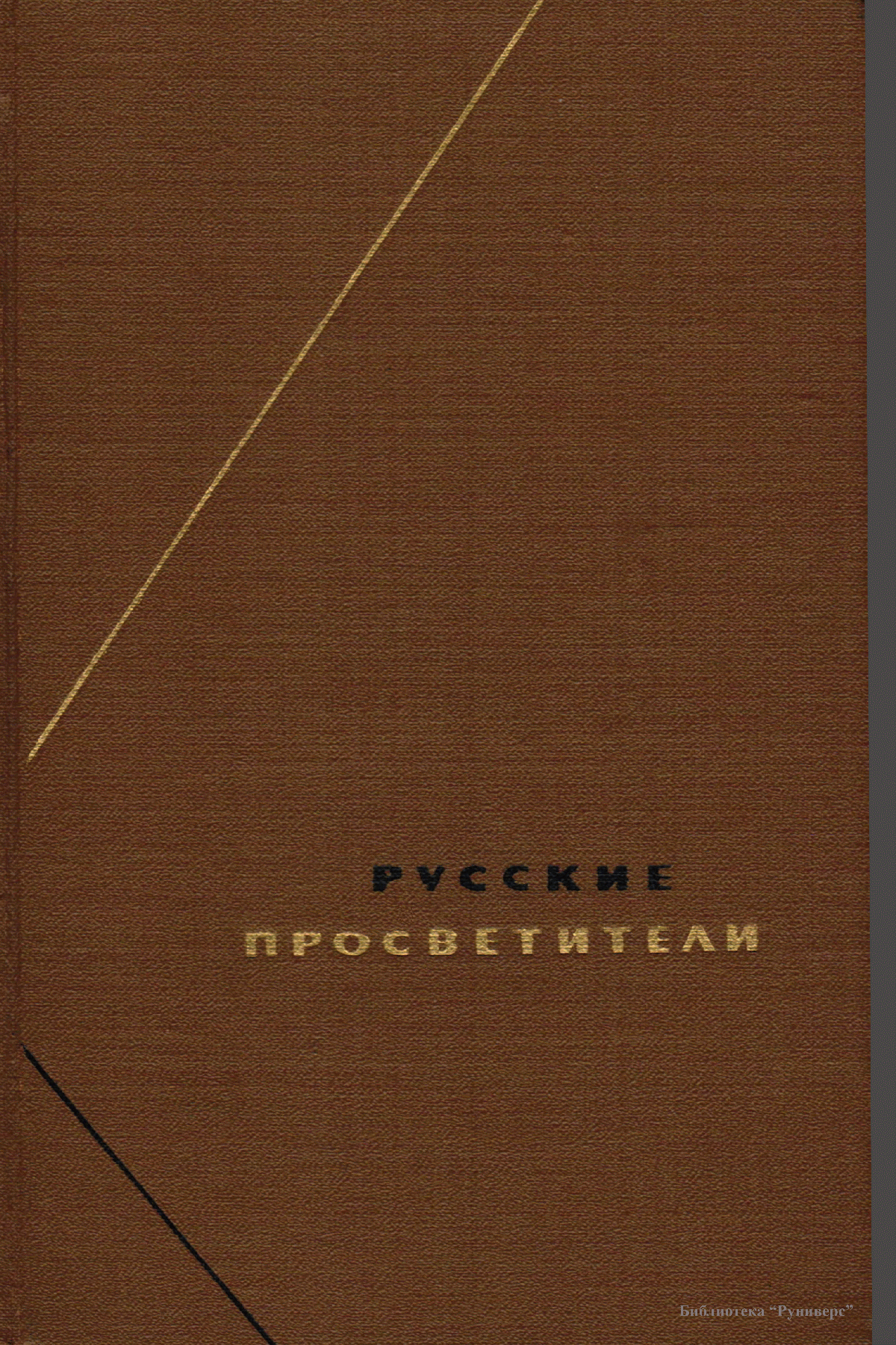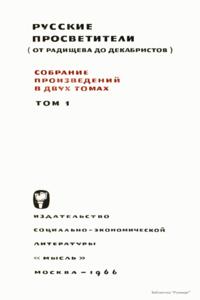 и до работ декабристов. Настоящее издание до известной степени призвано было познакомит советского читателя с совокупностью произведений русских просветителей конца XVIII - начала XIX века. В первый том вошли труды П.И. Челищева, В.В. Пассека, А.Ф. Бестужева, И.П. Пнина, В.Ф. Малиновского, А.С. Кайсарова. Вступительная статья И.Я. Щипанова. Во второй том издания вошли труды А.С. Лубкина, Т.Ф. Осиповского, А.П. Куницына. В приложении публикуется "Письмо о пользе учения к Василию Сергеевичу Шереметьеву" В.П. Колычева.