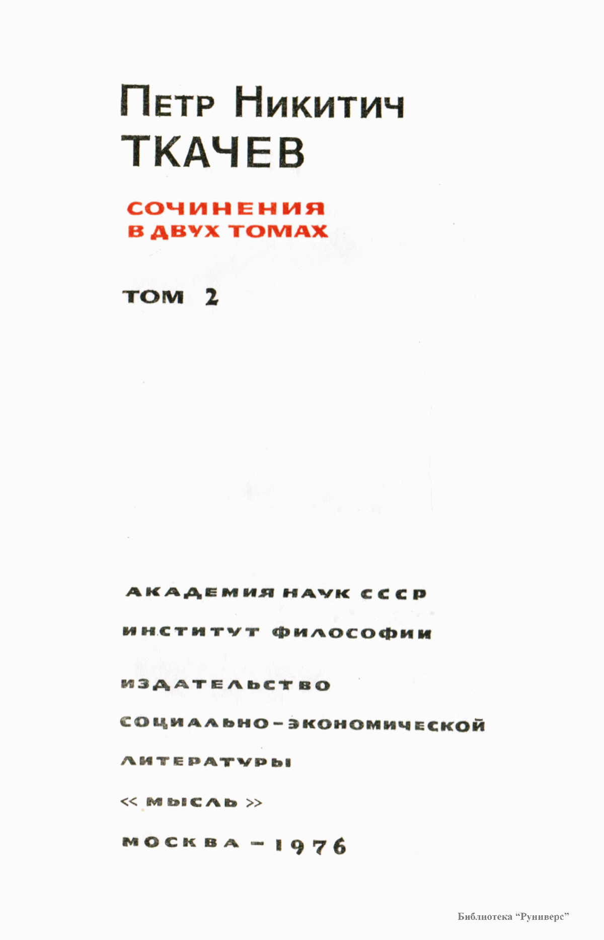 В первом томе собрания сочинений помещены произведения по философии, социологии, эстетике, педагогике и т. д., написанные П. Н. Ткачевым на родине в 60 — начале 70-х годов прошлого века. Значительная часть этих работ была напечатана лишь в журналах. В приложении даются юношеские стихи П. Н. Ткачева из его рукописного наследия. Во второй том включены произведения по философии, социологии, этике, истории, психологии, педагогике и т.д., а также основные программные статьи из органа «якобинского» течения в русском революционном народничестве журнала «Набат», написанные П. Н. Ткачевым в 70-х — начале 80-х годов XIX в. в эмиграции. Большинство произведений П. Н. Ткачева, напечатанных в журнале «Дело», ранее не переиздавались.