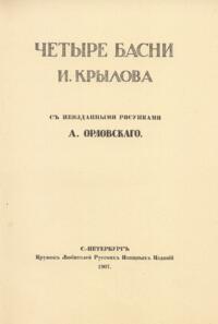 В это издание вошли четыре басни Ивана Андреевича Крылова: «Конь и всадник», «Квартет», «Собачья дружба» и «Демьянова уха», каждая из которых иллюстрирована не издававшимися ранее рисунками художника начала XIX века Александра Орловского. Издание отпечатано типографией Р. Голике и А. Вильборг на плотной бумаге верже желтоватого цвета.