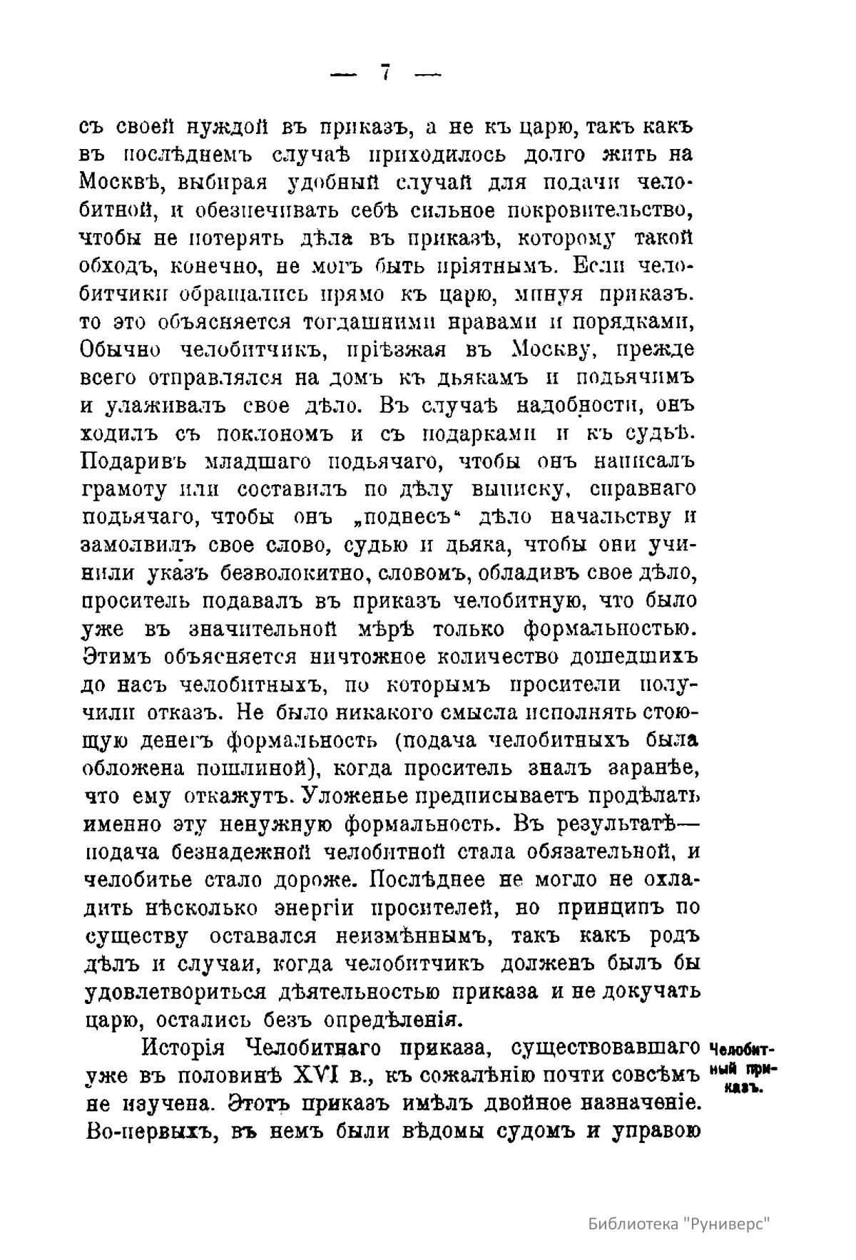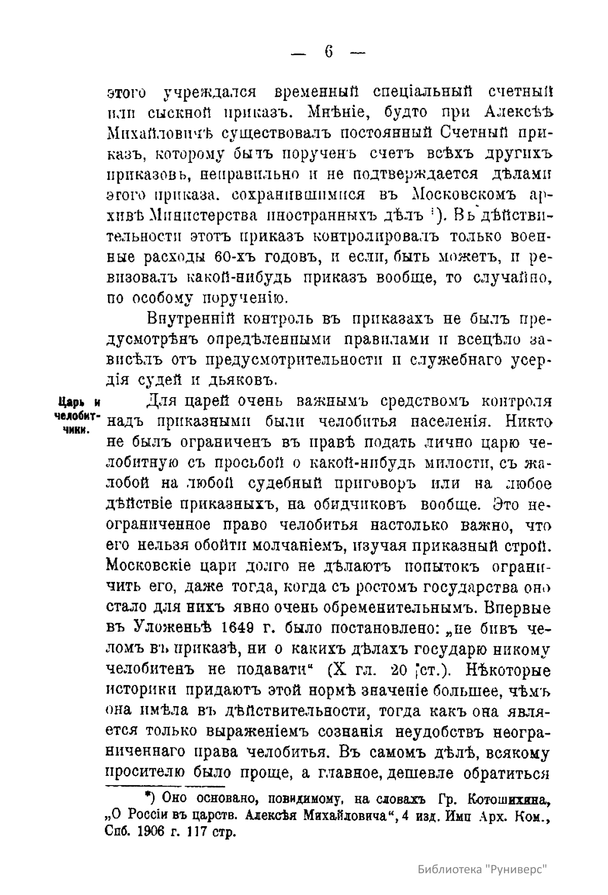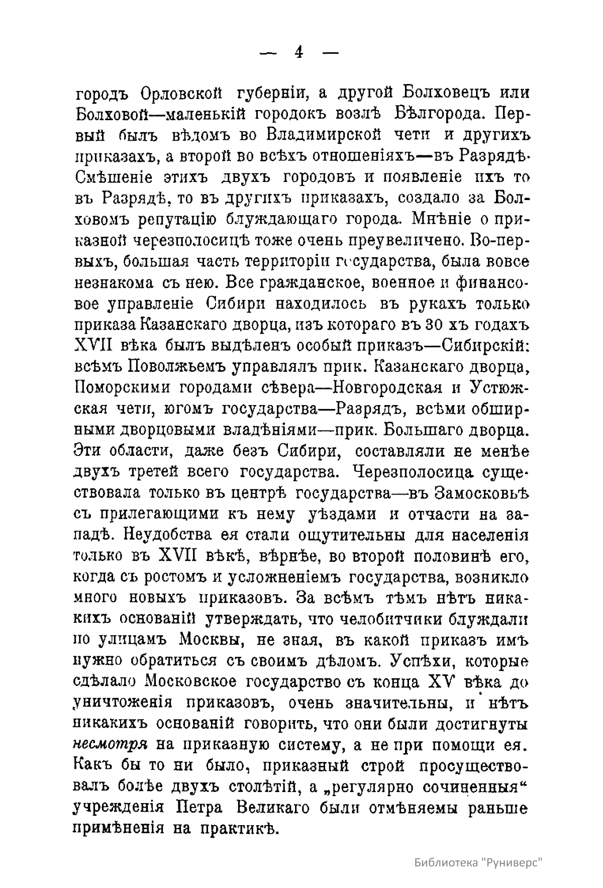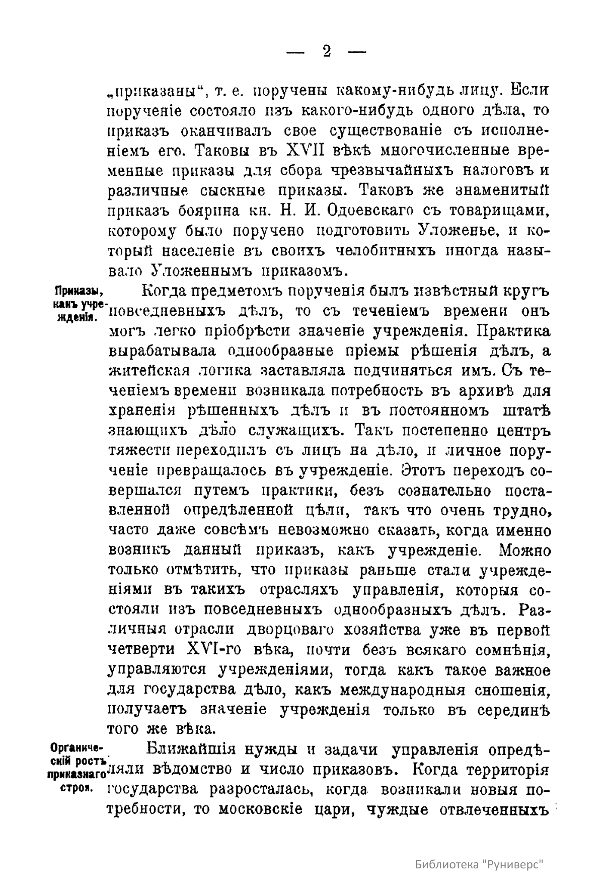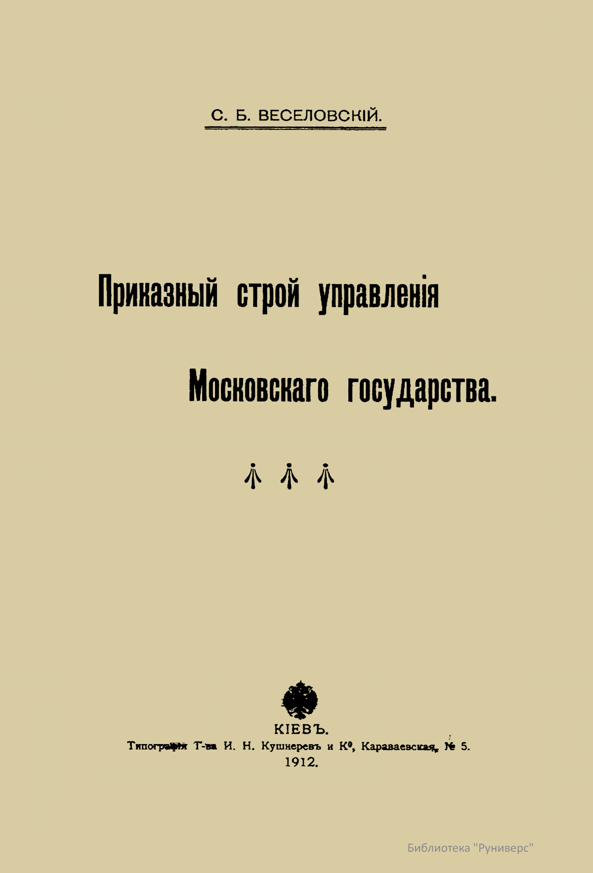 В издании анализируется система приказов, центральных исполнительных органов Московского государства, существовавших более двух столетий, прослеживается эволюция приказов от временных поручений до постоянных учреждений, подчеркивая их органический и несистематизированный рост, который, тем не менее, обеспечил системе практичность и устойчивость. Особое внимание уделяется роли царя как «души» системы, а также проблемам контроля, волокиты и коррупции, которые усилились при царях Михаиле Федоровиче и Алексее Михайловиче, что привело к возникновению Тайного приказа как симптома упадка старой системы. Подробно описывается структура и личный состав приказов (судей, дьяков и подьячих) и дается обзор важнейших приказов по их функциям и территориальной юрисдикции.
