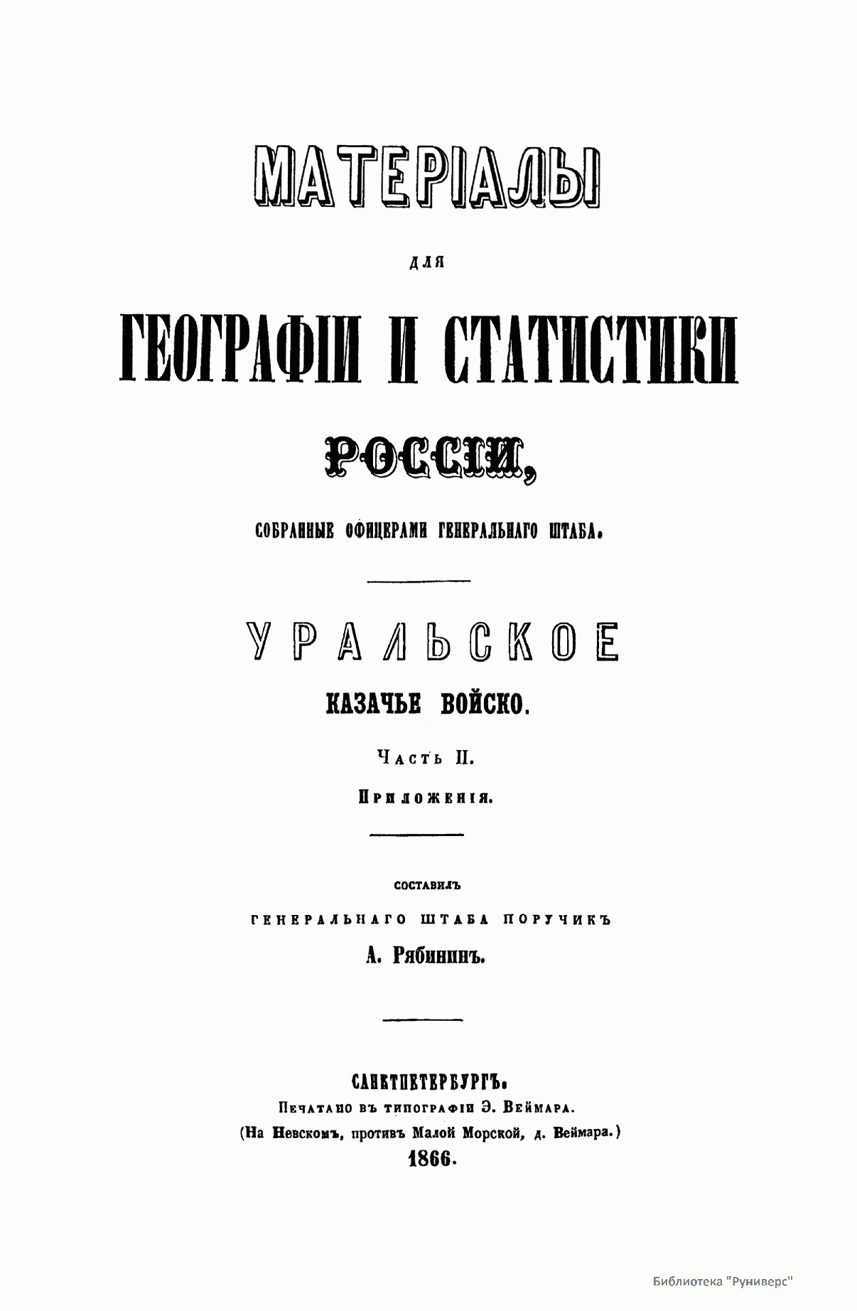 Матерiалы для географiи и статистики Россiии, собранные офицерами Генеральнаго штаба. Уральское казачье войско. Часть 2. Приложенiя