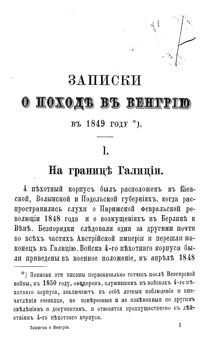 Книга известного российского военного писателя генерал-майора М.Д. Лихутина посвящена событиям, связанным с его участием в молодости в боевых действиях русских экспедиционных войск, которые были введены в Галицию и Трансильванию для помощи Австрии в подавлении восстания в Венгрии летом 1849 г. Находясь при штабе 4-го корпуса под командованием генерала от инфантерии М.И. Чеодаева в качестве офицера для особых поручений, Лихутин в своих путевых заметках подробно и живо описывает плачевное состояние общества в многонациональной империи Габсбургов, расколотой межэтническими и межконфессиональными распрями. Автор в своих мемуарах детально рассказывает о боях с участием дивизий и полков 4-го корпуса русской армии по овладению городом Дебречин (Дебрецин), который являлся в это время столицей революционной Венгрии, преследовании русскими войсками повстанческой венгерской армии Гёргея, участии в сражении под Мишкольцами и других событиях этой кампании вплоть до капитуляции революционных войск Венгрии.
