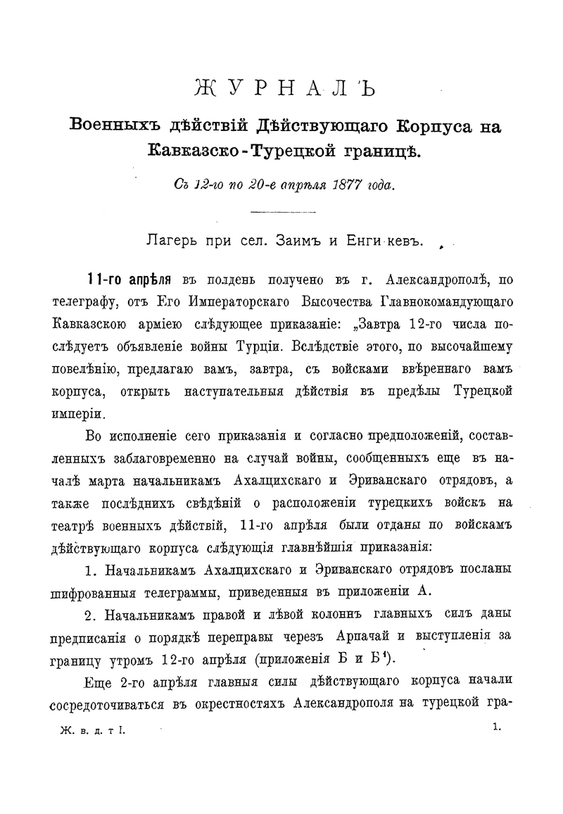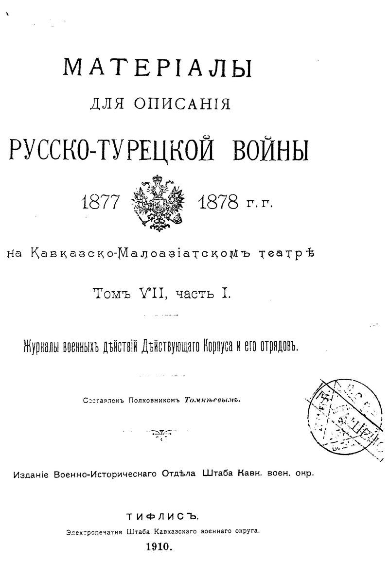 Материалы для описания русско-турецкой войны 1877-1878 гг. на Кавказско-Малоазиатском театре. Том VII, часть I