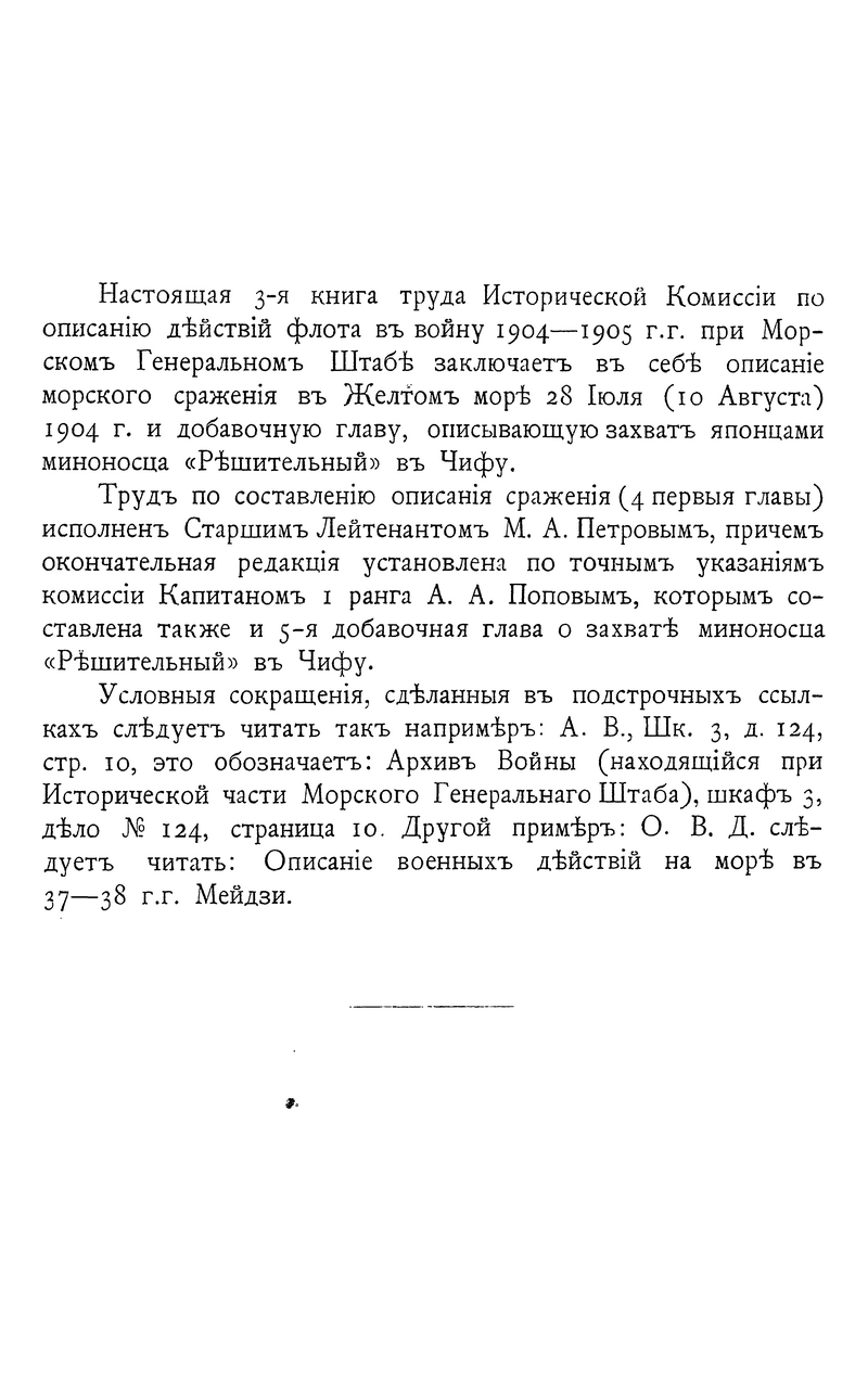Данное многотомное военно-историческое исследование было подготовлено и издано в результате кропотливой и длительной деятельности. Исторической комиссии по описанию действий российского императорского флота и его личного состава в годы русско-японской войны 1904-1905 гг., специально созданной при Морском генеральном штабе для изучения трагических последствий этой войны для России и её флота.