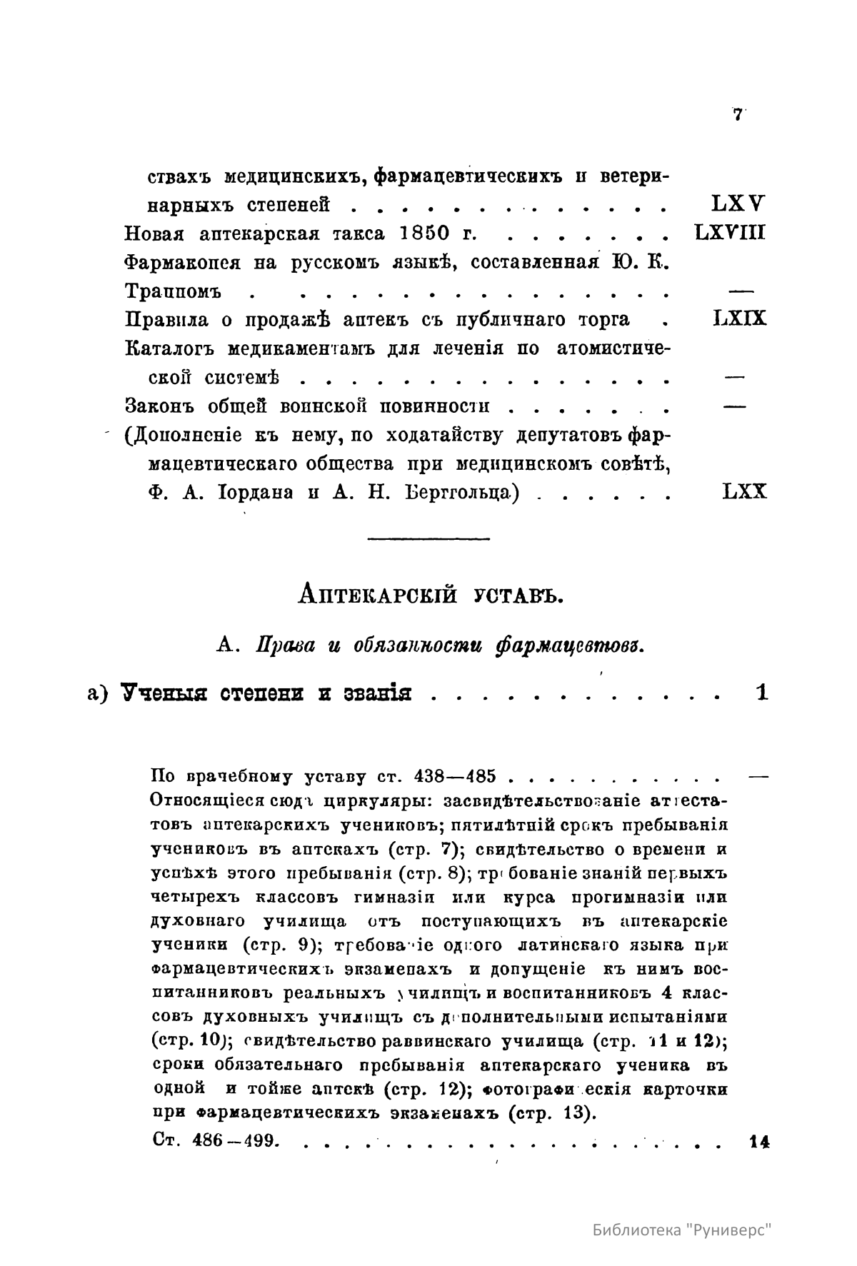 • Учреждение и устройство аптек: Приведены правила открытия новых аптечных заведений, нормы по количеству жителей и рецептов на одну аптеку, а также требования к внутреннему устройству помещений (лабораторий, материальных комнат, ледников),,,.