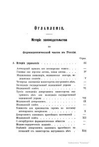 • История законодательства: В книге представлен масштабный исторический очерк управления фармацевтической частью, начиная с учреждения Аптекарского приказа (XVII век) и заканчивая реформами второй половины XIX века,. Рассматривается эволюция фармацевтического сословия, появление первых «вольных» (частных) аптек и развитие военного аптечного дела,.