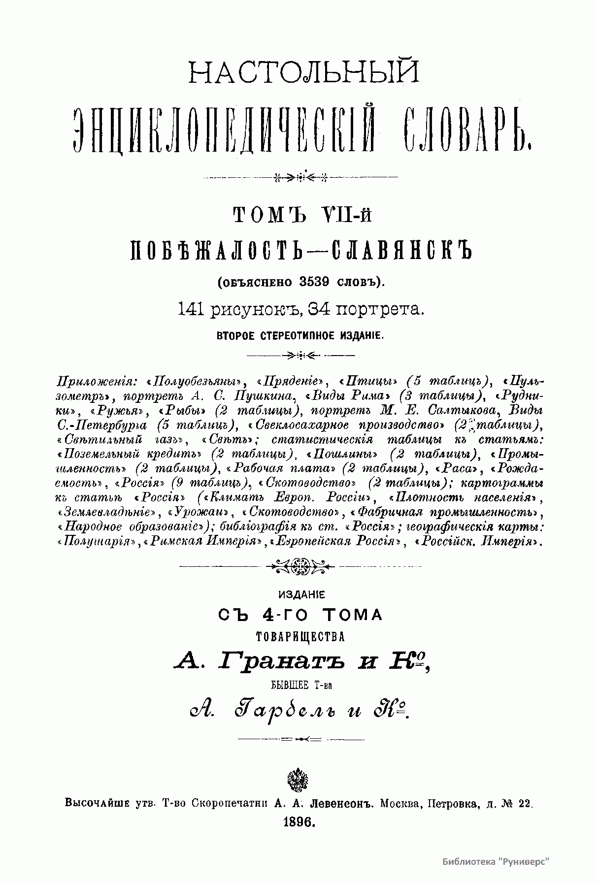 Настольный Энциклопедический Словарь "Гранат" - одна из крупнейших русских универсальных энциклопедий. В 1892 А. Гранат приобрёл издательские права на «Настольный энциклопедический словарь» товарищества "А. Гарбель и К°", выходивший в Москве с 1891, и с 4-го тома издание словаря было продолжено товариществом "А. Гранат и К°". Редакция поставила своей целью сделать Словарь не только справочною, но и образовательною книгою, стремилась, чтобы руководящие статьи заключали в себе весь тот минимум сведений, которым должен располагать образованный человек одинаково по всем отраслям знания. Все, касающееся России, излагалось полнее и всегда в тесной связи с жизнью и развитием других культурных народов. В справочном отделе на первом плане стояла точность, современность и полнота сведений по каждому из слов. Словарь касается всех областей знания: наука, техника, биология, география, этнография, археология, приведены статистические данные по странам и отраслям, биографические сведения и т.д. 8 томов словаря содержат 60 000 статей, 5358 страниц, свыше 1300 иллюстраций (в том числе цветных).