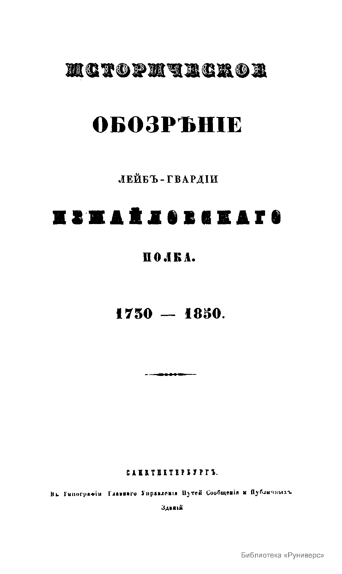 Историческое обозрѣнiе Лейбъ-гвардiи Измайловскаго полка. 1730-1850