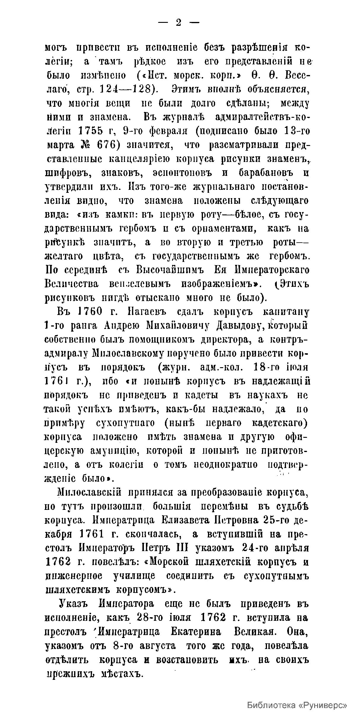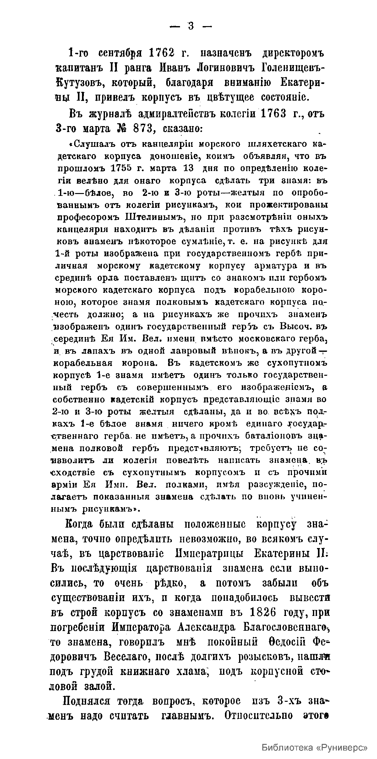 Статья была подготовлена в связи прошедшим 200-летием со дня основания Морского кадетского корпуса, ведущего свое начало от Навигацкой школы, основанной в Москве в январе 1701 года, а с 1715 года дополненной созданием в Санкт-Петербурге Морской академии. В 1752 году на базе Навигацкой школы и Морской академии был образован Морской кадетский корпус, трем ротам которого были определены три знамени. Однако, об их существовании вспомнили лишь в 1826 году, когда корпус участвовал в торжественных похоронах Александра I. Наконец, в 1852 году, в связи со 100-летней годовщиной Морского корпуса Николай I распорядился о даровании Корпусу нового знамени, которое было прибито на древко в декабре 1852 года в Зимнем дворце в присутствии всей царской семьи. Автором статьи выступил капитан 2-го ранга П.И. Белавенец – известный военный и военно-морской историк, отдавший долгие годы изучению российской государственной и военной символики.