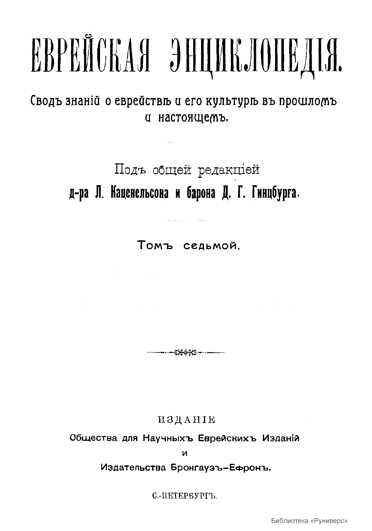 Первый крупный энциклопедический свод знаний о еврействе на русском языке. Энциклопедия была опубликована в 1908 – 1913 гг. в шестнадцати томах в Санкт-Петербурге «Обществом для научных еврейских изданий» и «Издательством Брокгауз – Ефрон». Основой и образцом для нее послужила вышедшая несколько годами ранее двенадцатитомная «The Jewish Encyclopedia» (London; New York, 1901 – 1906). Однако ее материал был существенно дополнен и расширен авторами «Еврейской Энциклопедии Брокгауза» во всем, что касалось истории, культуры и современного положения еврейских общин в Восточной Европе. В работе над «Еврейской энциклопедией Брокгауза» принимали участие виднейшие представители российской иудаики, гебраистики и востоковедения: А.Гаркави, Д. Гинцбург, Ю Гессен, С. Дубнов, И. Маркон, Н. Переферкович. «Еврейская энциклопедия Брокгауза» до сих пор остается одним из важнейших источников справочной информации и статистических данных о почти шестимиллионном еврейском населении Российской империи начала XX в. И потому ее данные можно отнести к числу ценных источников сведений по социально-политической, этнической, культурно-религиозной истории и исторической демографии России и сопредельных ей стран.