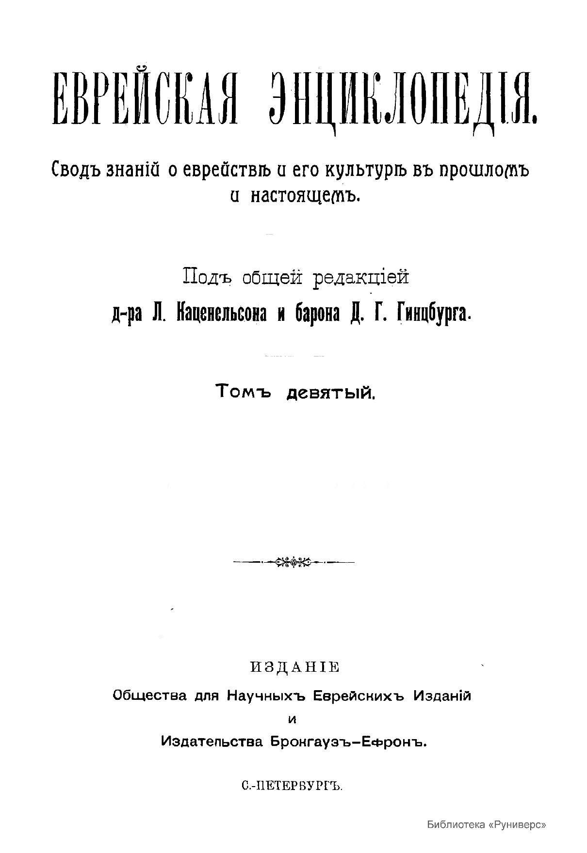 Первый крупный энциклопедический свод знаний о еврействе на русском языке. Энциклопедия была опубликована в 1908 – 1913 гг. в шестнадцати томах в Санкт-Петербурге «Обществом для научных еврейских изданий» и «Издательством Брокгауз – Ефрон». Основой и образцом для нее послужила вышедшая несколько годами ранее двенадцатитомная «The Jewish Encyclopedia» (London; New York, 1901 – 1906). Однако ее материал был существенно дополнен и расширен авторами «Еврейской Энциклопедии Брокгауза» во всем, что касалось истории, культуры и современного положения еврейских общин в Восточной Европе. В работе над «Еврейской энциклопедией Брокгауза» принимали участие виднейшие представители российской иудаики, гебраистики и востоковедения: А.Гаркави, Д. Гинцбург, Ю Гессен, С. Дубнов, И. Маркон, Н. Переферкович. «Еврейская энциклопедия Брокгауза» до сих пор остается одним из важнейших источников справочной информации и статистических данных о почти шестимиллионном еврейском населении Российской империи начала XX в. И потому ее данные можно отнести к числу ценных источников сведений по социально-политической, этнической, культурно-религиозной истории и исторической демографии России и сопредельных ей стран.