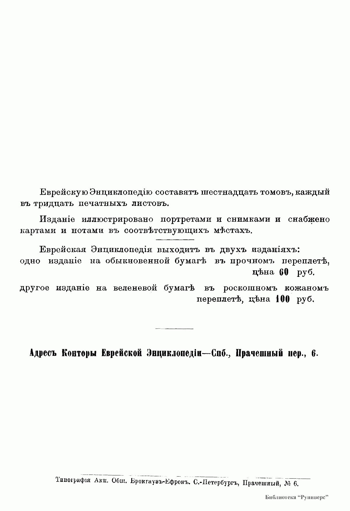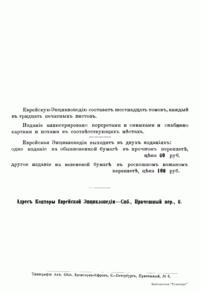 Первый крупный энциклопедический свод знаний о еврействе на русском языке. Энциклопедия была опубликована в 1908 – 1913 гг. в шестнадцати томах в Санкт-Петербурге «Обществом для научных еврейских изданий» и «Издательством Брокгауз – Ефрон». Основой и образцом для нее послужила вышедшая несколько годами ранее двенадцатитомная «The Jewish Encyclopedia» (London; New York, 1901 – 1906). Однако ее материал был существенно дополнен и расширен авторами «Еврейской Энциклопедии Брокгауза» во всем, что касалось истории, культуры и современного положения еврейских общин в Восточной Европе. В работе над «Еврейской энциклопедией Брокгауза» принимали участие виднейшие представители российской иудаики, гебраистики и востоковедения: А.Гаркави, Д. Гинцбург, Ю Гессен, С. Дубнов, И. Маркон, Н. Переферкович. «Еврейская энциклопедия Брокгауза» до сих пор остается одним из важнейших источников справочной информации и статистических данных о почти шестимиллионном еврейском населении Российской империи начала XX в. И потому ее данные можно отнести к числу ценных источников сведений по социально-политической, этнической, культурно-религиозной истории и исторической демографии России и сопредельных ей стран.