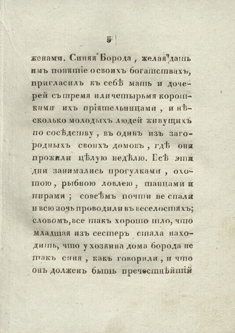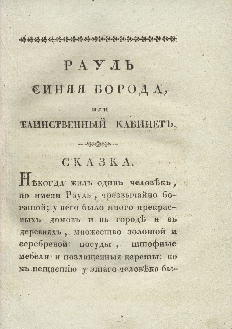 В этой книге есть еще один интересный момент: переводчиком Перро выступил артист Императорского московского театра – Баранов. Вероятно, ему принадлежала идея составить сборник именно тех сказок Шарля Перро, которые легли в основу музыкальных произведений – опер и балетов. В этом, очевидно, был тоже поучительный момент: дети познавали и мир музыки. Поэтому второе название сборника «Приятное занятие от нечего делать» вызывает улыбку: вот так в начале XIX века, когда нечего было делать, проводили время взрослые и дети.