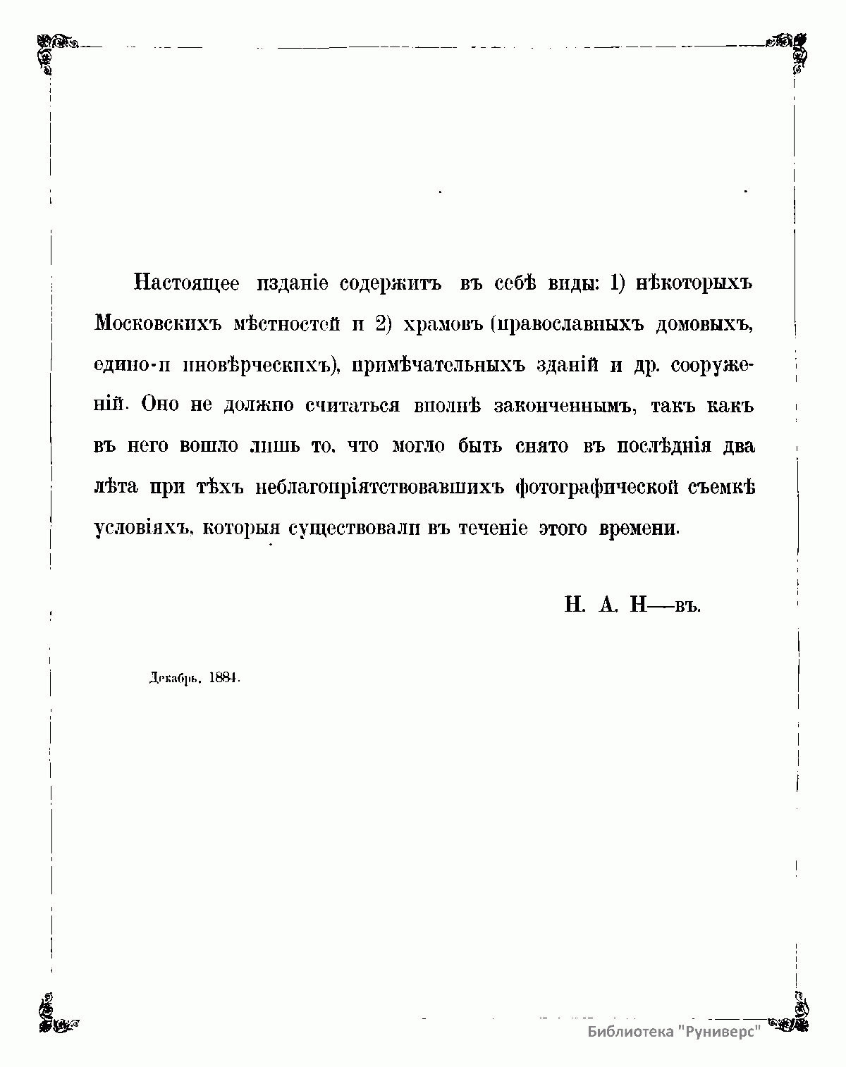 Цель настоящего издания сохранить на память будущему вида существовавших во второй половине девятнадцатого века в Москве храмов, не касаясь при этом того, какое значение они имеют в отношении историческом, археологическом или архитектурном. Местоположение большинства храмов было неудобно для фотографической съемки, поэтому автору не удалось сделать все снимки в одинаковом относительно действительности размере. Издание разделено на четыре части. 1. Кремль и Китай-город – 33 изображения. 2. Белый город – 59 изображений. 3. Земляной город в двух отделениях: а) его часть по левую сторону Москвы-реки – 72 изображения, б) часть Замоскворецкая – 36 изображений. 4. Местность за Земляным городом – 73 изображения. Приложенный к каждой части текст составляет оглавление.
