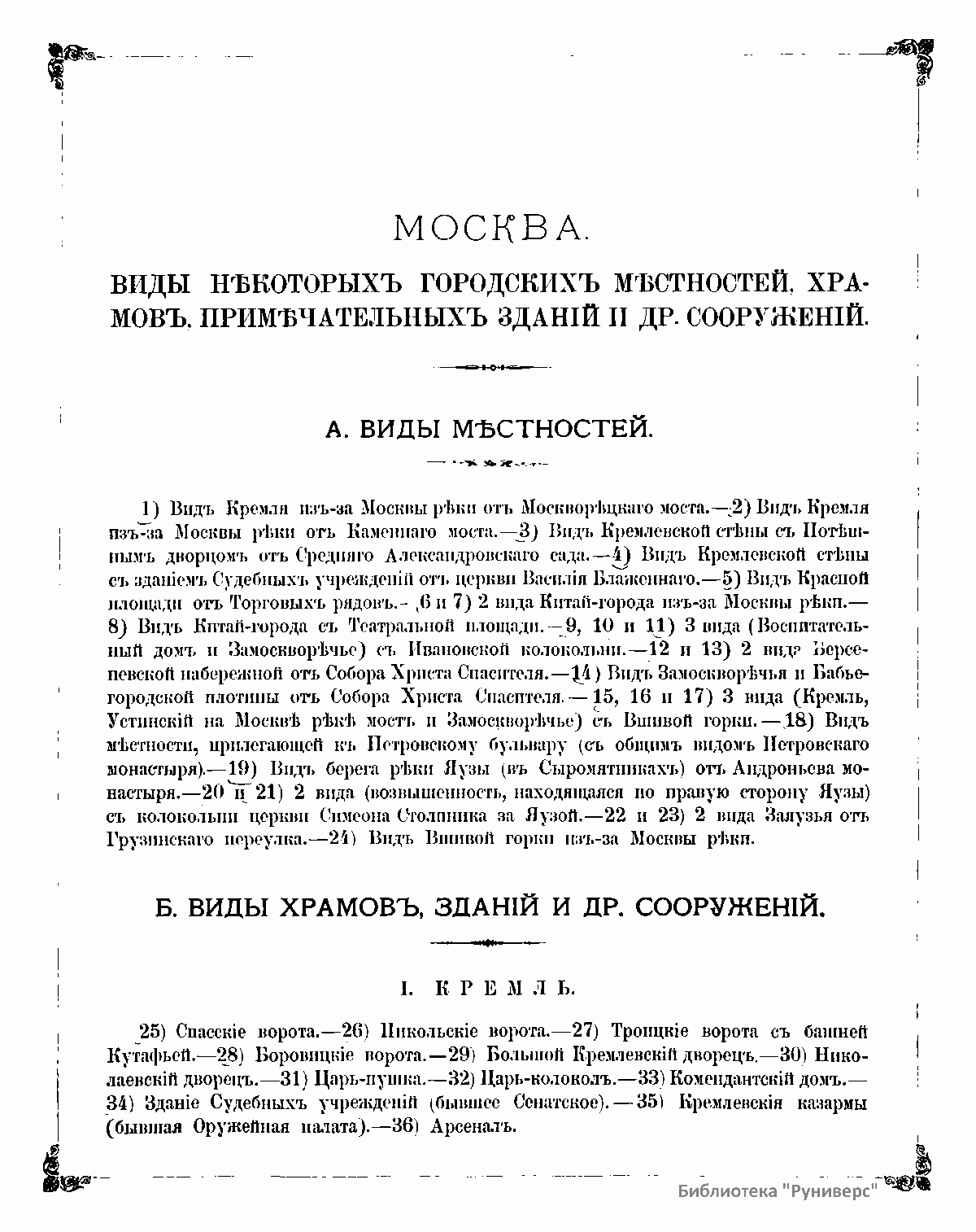Москва. Соборы, монастыри и церкви. Виды нѣкоторыхъ городскихъ мѣстностей, храмовъ, примѣчательныхъ зданiй и другихъ сооруженiй