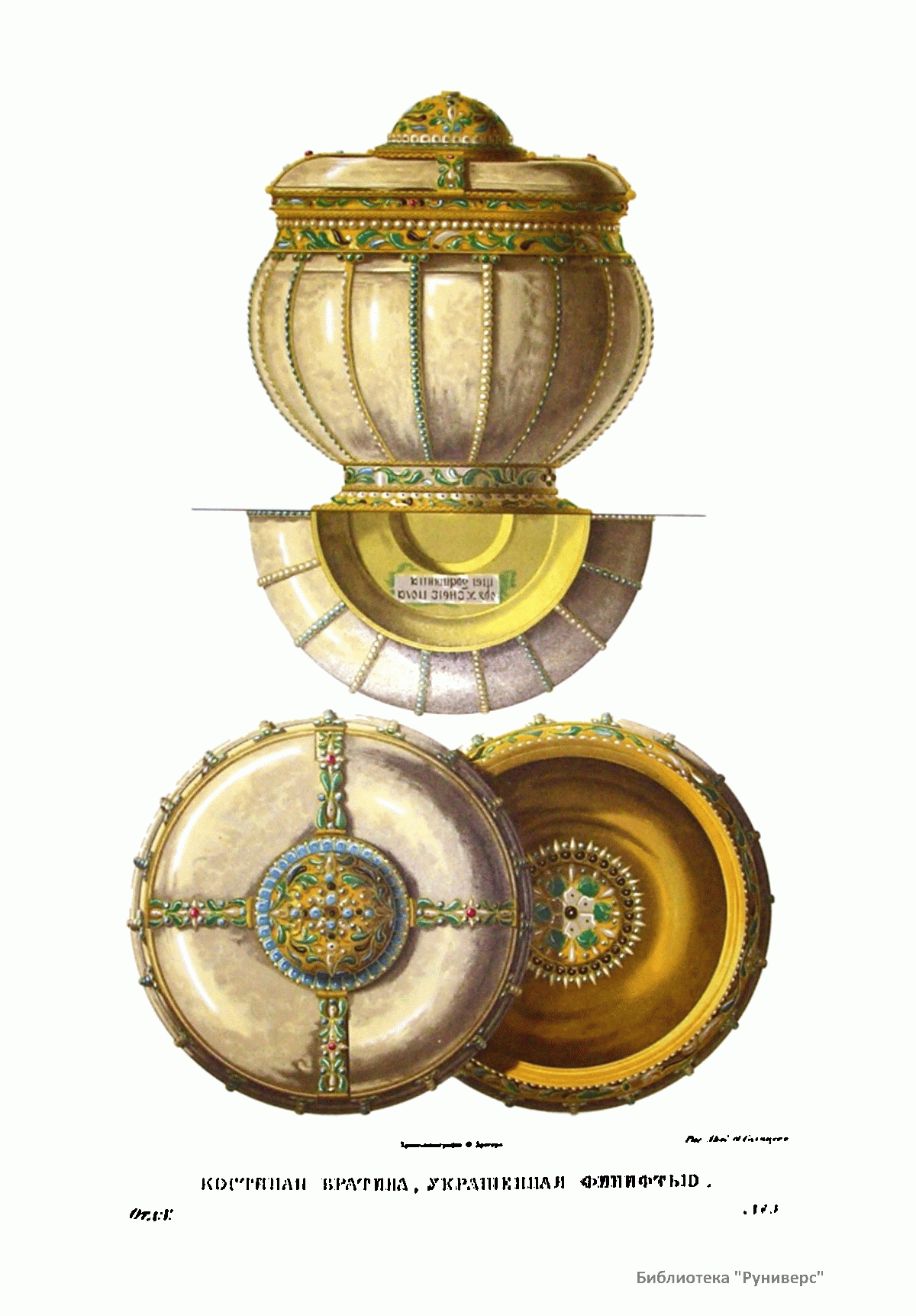 Авторы настоящего издания считают, что время охранения памятников России настало со вступления на престол Императора Николая I. Повелевая хранить памятники и остатки русских древностей, он приказал все, что заслуживает внимание и составляет материал истории, отчетливо срисовать, описать и издать. Император повелел учредить в Москве Комитет издания древностей Российского государства. Первый отдел огромного и великолепного издания «Древности Российского государства» состоит из 500 большого формата рисунков, распределенных по своему содержанию на шесть частей с соответствующим описанием. Первая часть «Древностей» заключает в себе священные памятники: а) образа и кресты, замечательные в историческом и художественном отношении, б) храмовую утварь разных времен, в) облачения духовного сана. Вторая часть содержит древний царский чин, или священное облачение русских великих князей и царей при поставлении на царство. В третьей части представлена древняя броня и оружие. Четвертую часть составляют древние великокняжеские, царские, боярские и местные народные одежды в изображениях и портретах. В пятой части можно увидеть древнюю царскую столовую утварь. Шестая часть состоит из памятников древнего русского зодчества.