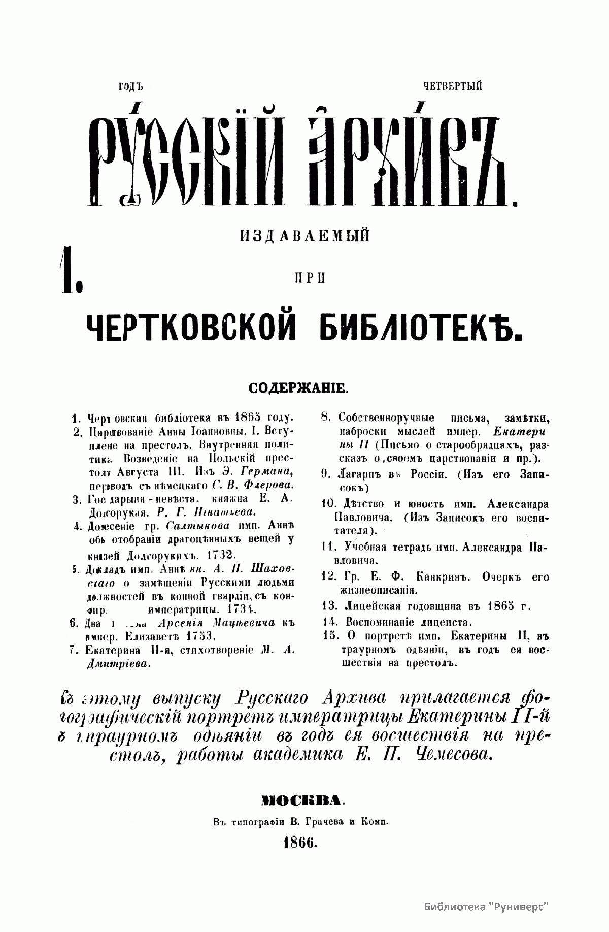 Русскiй архивъ. Историко-литературный сборникъ. 1866. Выпуски 1-6