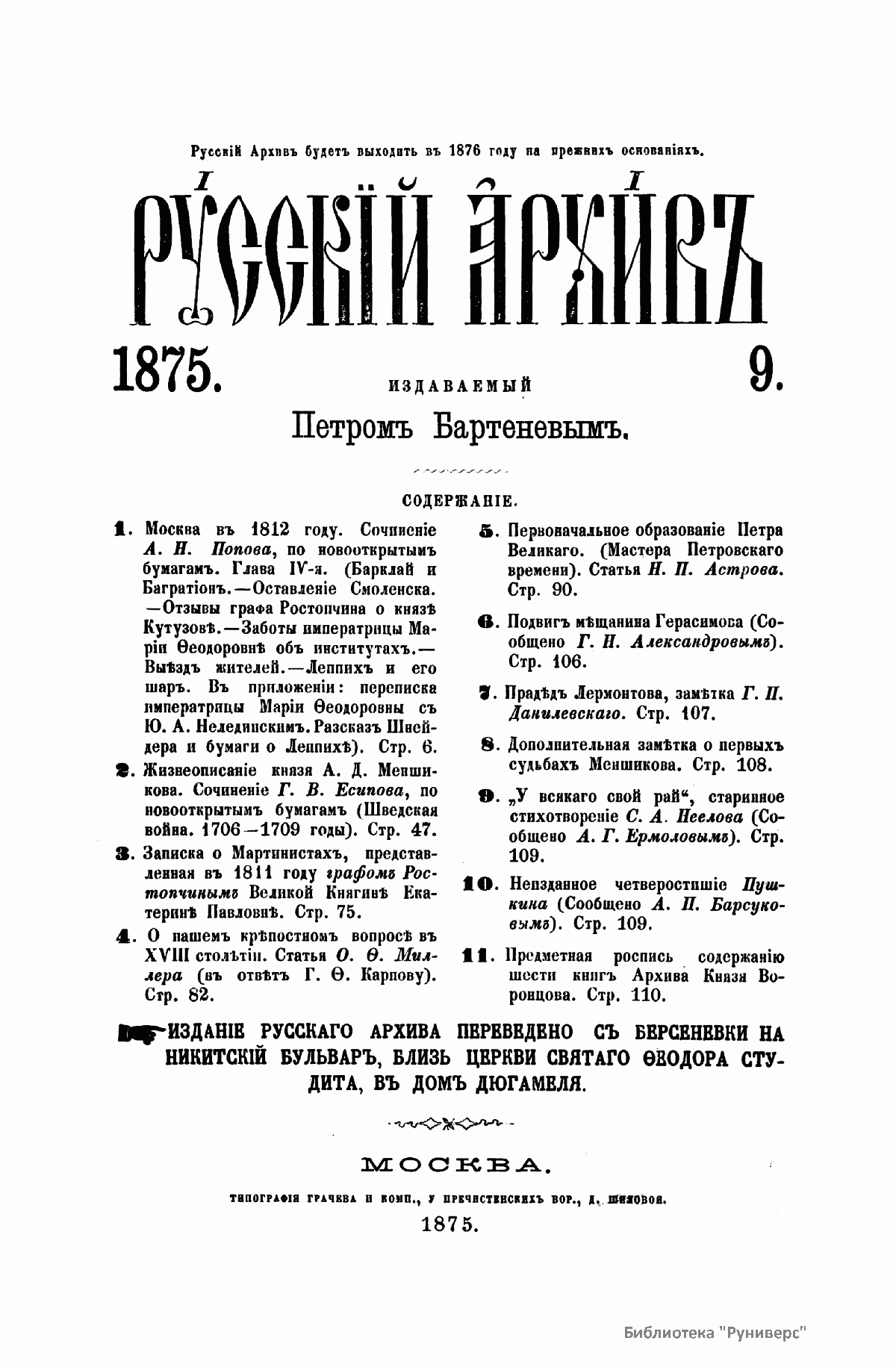 Русскiй архивъ. Историко-литературный сборникъ. 1875. Выпуски 9-12