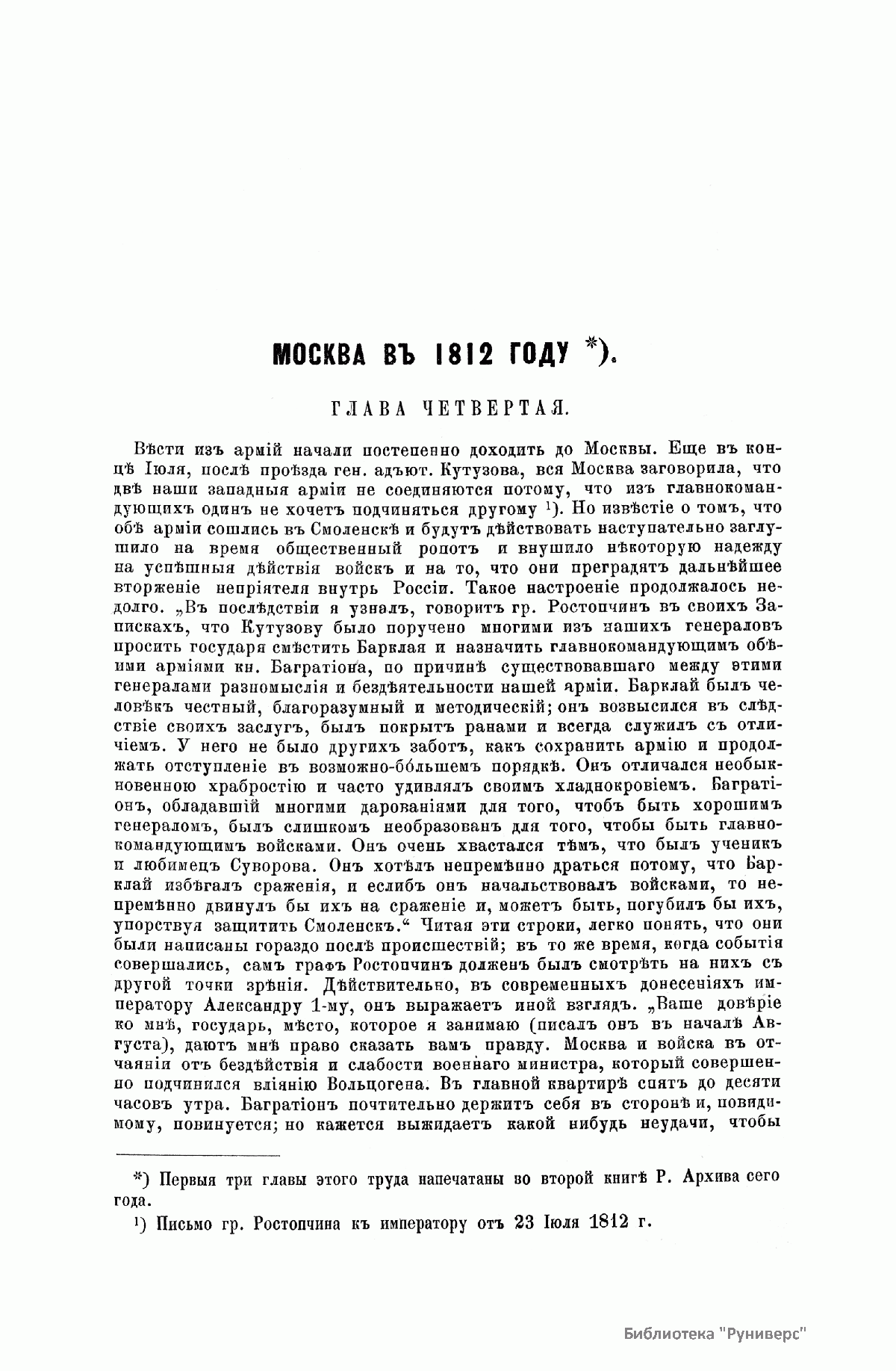 «Русский архив» — ежемесячный историко-литературный журнал, издававшийся в Москве с 1863 по 1917 год. Создателем и продолжительные годы редактором журнала был П. И. Бартенев – историк, археограф, библиограф. Этот журнал называли «живой картиной былого», поскольку он содержал преимущественно публикации неизданных мемуарных, эпистолярных, литературно-художественных и ведомственных документальных материалов, освещавших культурную и политическую историю России в XVIII и XIX вв. По числу опубликованных источников «Русский архив» стоит на первом месте среди русских исторических журналов.