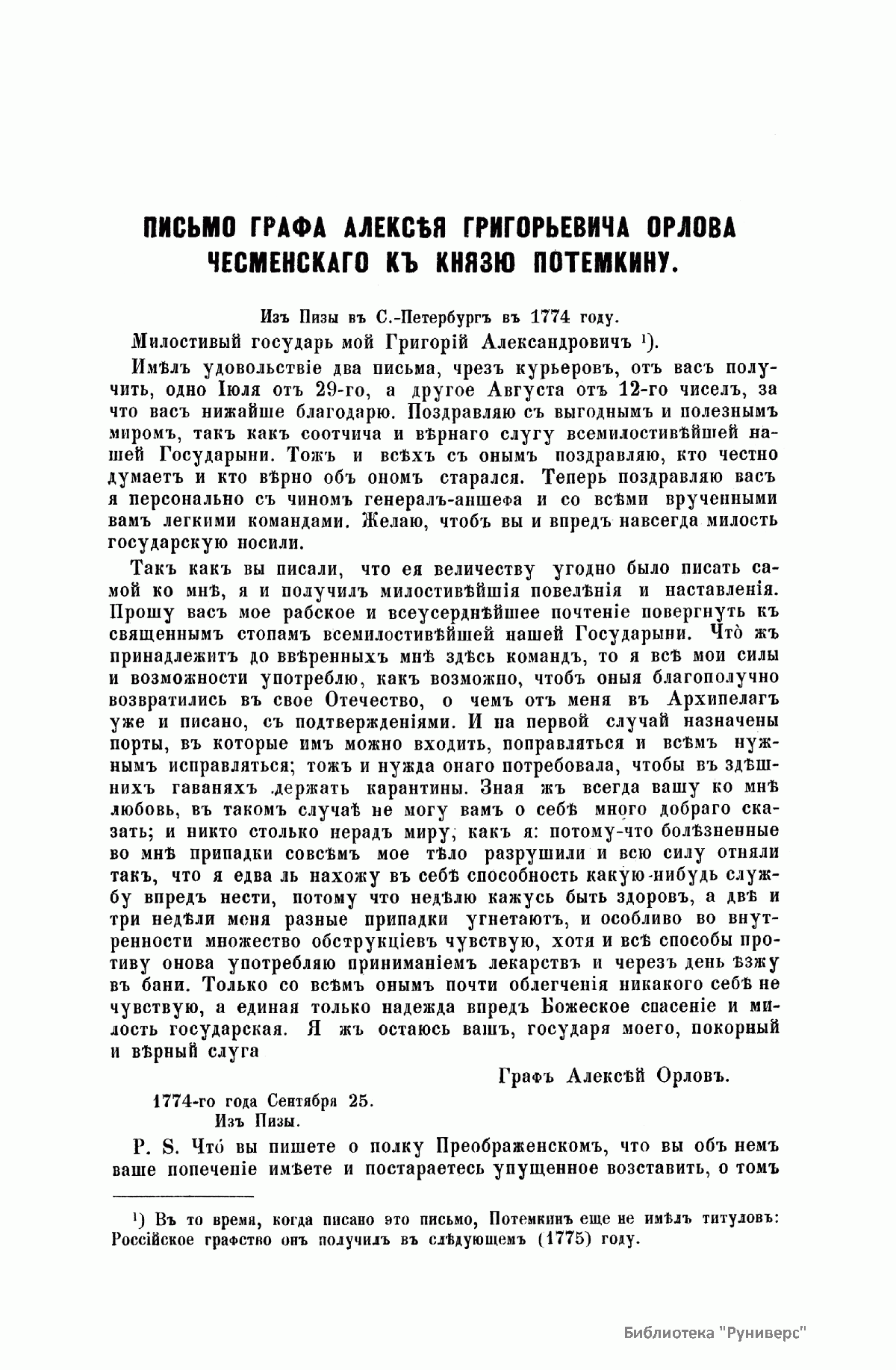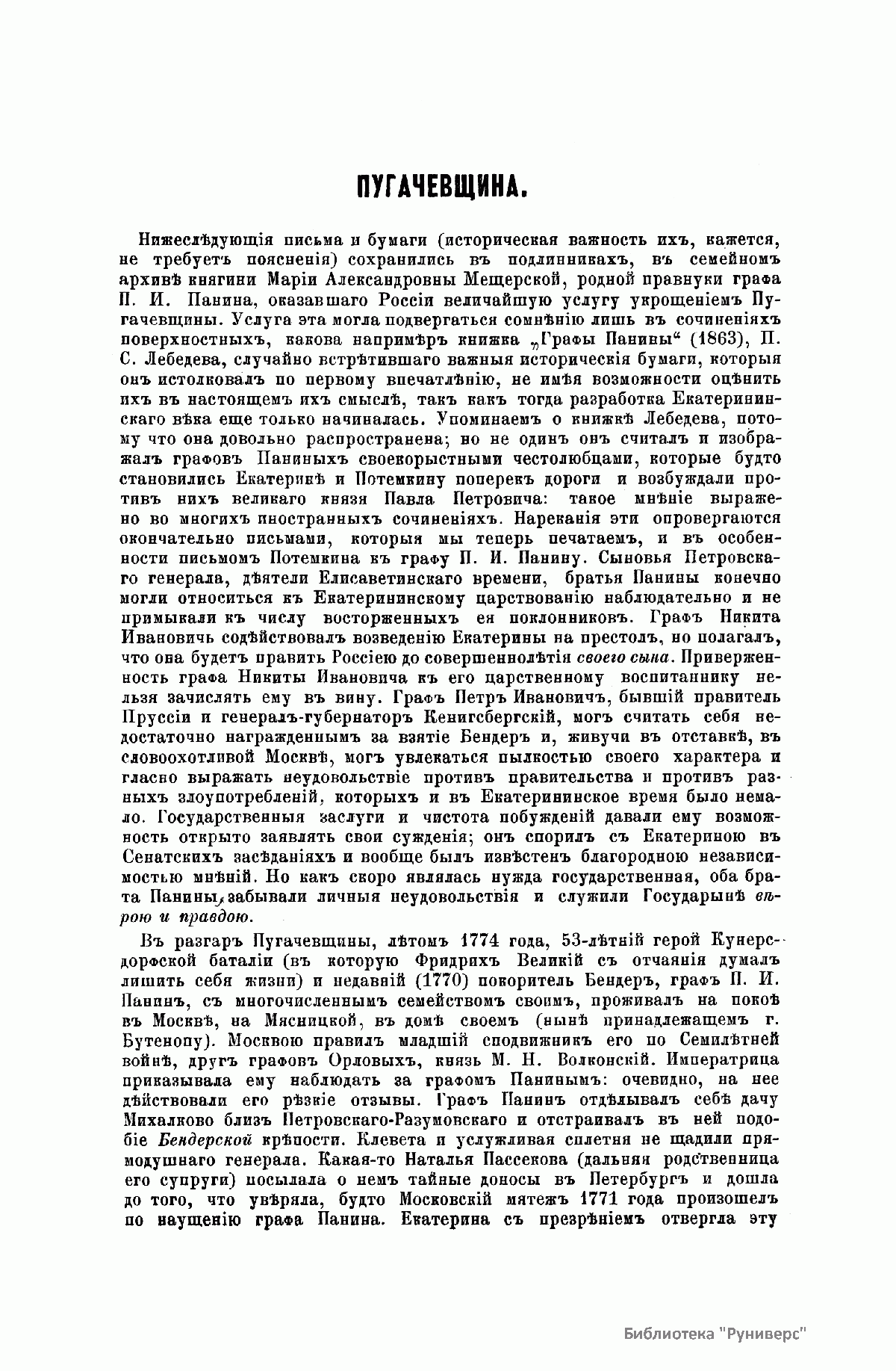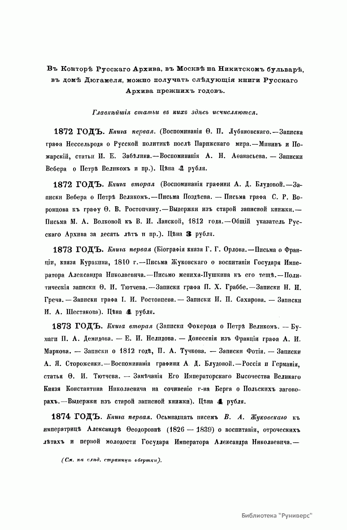«Русский архив» — ежемесячный историко-литературный журнал, издававшийся в Москве с 1863 по 1917 год. Создателем и продолжительные годы редактором журнала был П. И. Бартенев – историк, археограф, библиограф. Этот журнал называли «живой картиной былого», поскольку он содержал преимущественно публикации неизданных мемуарных, эпистолярных, литературно-художественных и ведомственных документальных материалов, освещавших культурную и политическую историю России в XVIII и XIX вв. По числу опубликованных источников «Русский архив» стоит на первом месте среди русских исторических журналов.