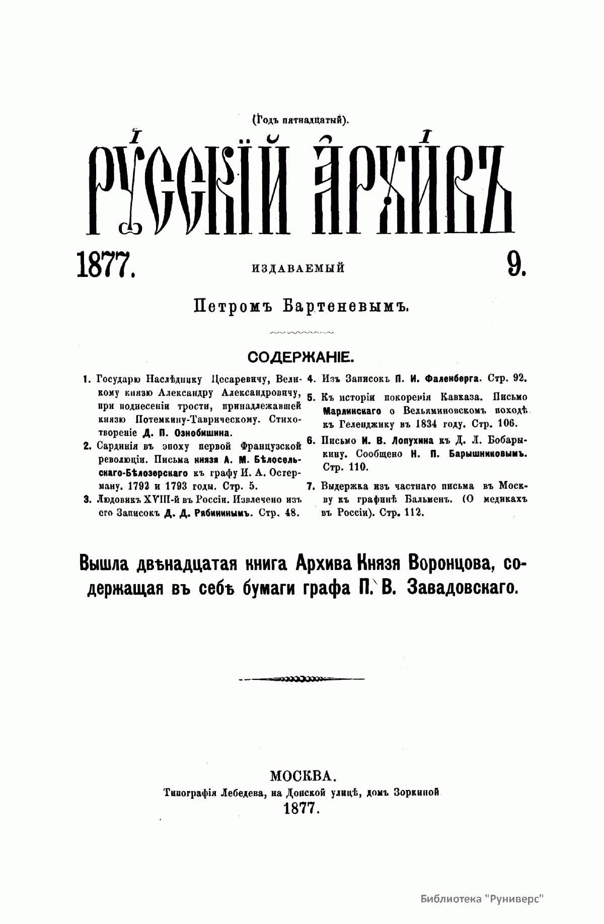 Русскiй архивъ. Историко-литературный сборникъ. 1877. Выпуски 9-12