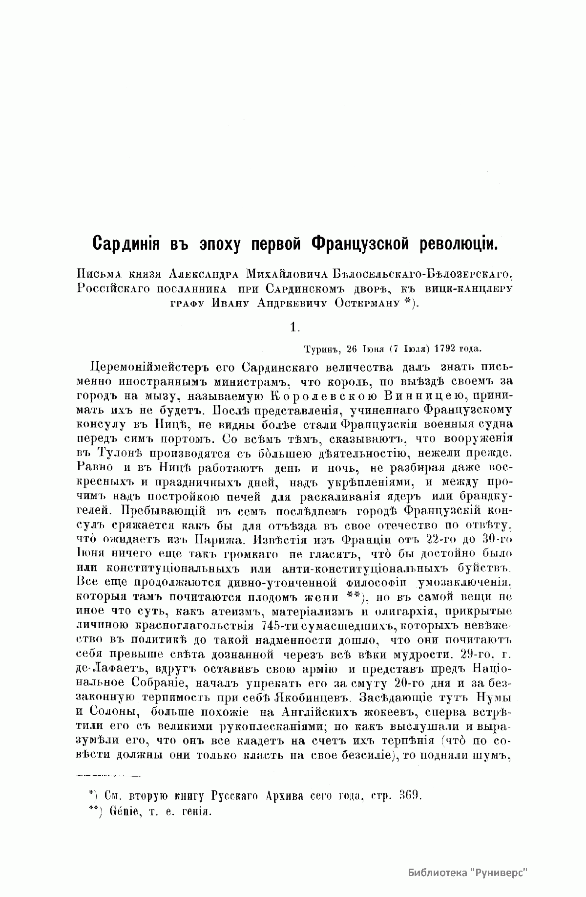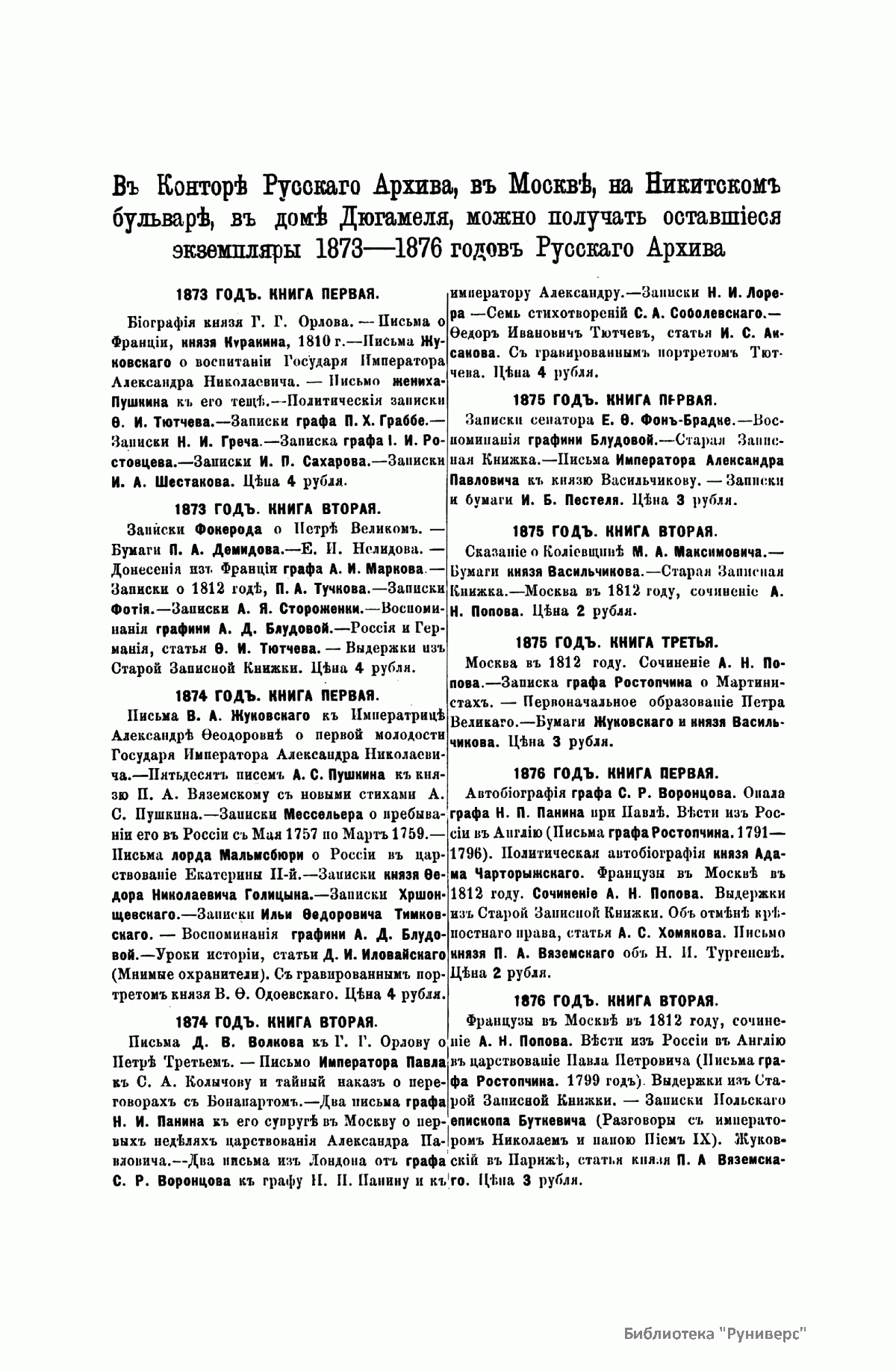 «Русский архив» — ежемесячный историко-литературный журнал, издававшийся в Москве с 1863 по 1917 год. Создателем и продолжительные годы редактором журнала был П. И. Бартенев – историк, археограф, библиограф. Этот журнал называли «живой картиной былого», поскольку он содержал преимущественно публикации неизданных мемуарных, эпистолярных, литературно-художественных и ведомственных документальных материалов, освещавших культурную и политическую историю России в XVIII и XIX вв. По числу опубликованных источников «Русский архив» стоит на первом месте среди русских исторических журналов.
