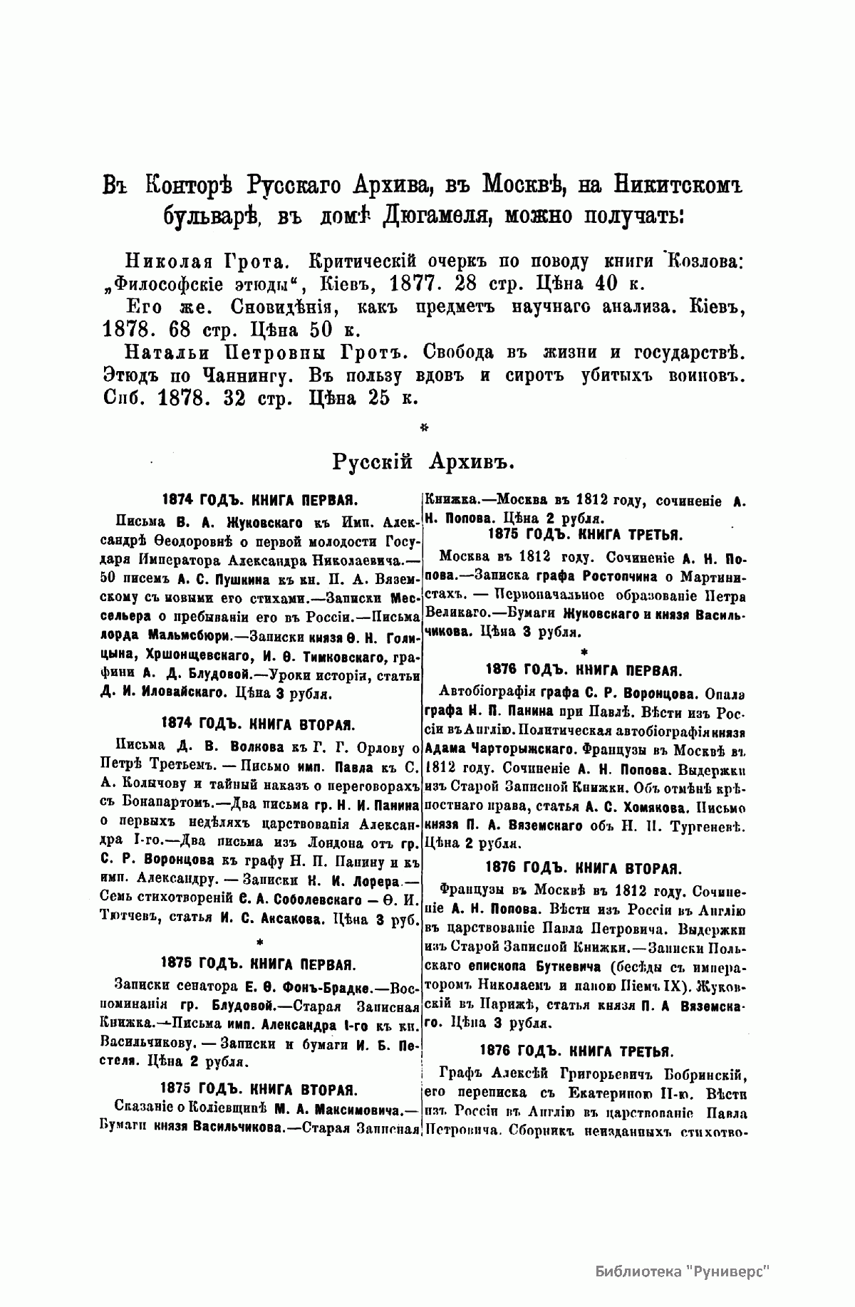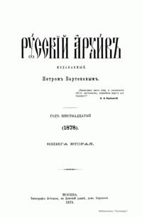 «Русский архив» — ежемесячный историко-литературный журнал, издававшийся в Москве с 1863 по 1917 год. Создателем и продолжительные годы редактором журнала был П. И. Бартенев – историк, археограф, библиограф. Этот журнал называли «живой картиной былого», поскольку он содержал преимущественно публикации неизданных мемуарных, эпистолярных, литературно-художественных и ведомственных документальных материалов, освещавших культурную и политическую историю России в XVIII и XIX вв. По числу опубликованных источников «Русский архив» стоит на первом месте среди русских исторических журналов.